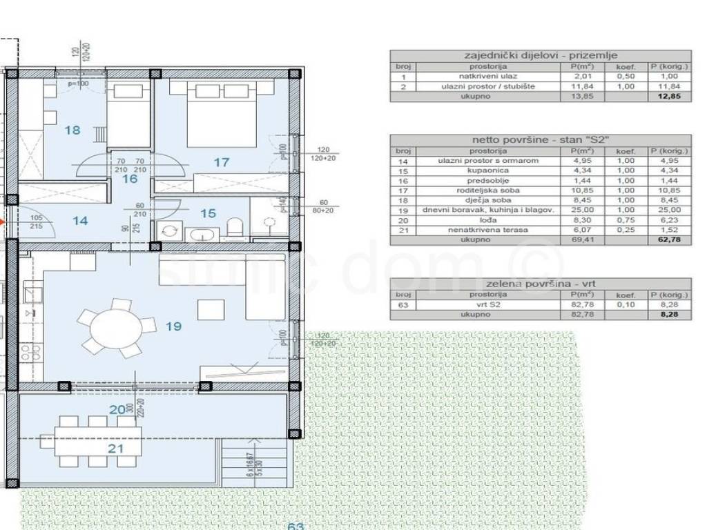 We mediate in the sale of apartments in a new project in Kastel Sucurac. The building is located on a quiet street, above the expressway, and all apartments will be south-facing with a view of the Kaštela Bay. The building will have a total of three comfortable two-bedroom apartments and one luxurious two-story three-bedroom apartment with a garage. Apartment S2 is located on the ground floor of the building and has 55.04 m2 of interior space, 14.37 m2 of terrace (loggia) and 82.78 m2 of garden. With all the accessories, the apartment has a net usable area of 71.06 m2, and consists of a hallway, two bedrooms, a bathroom, and an open-concept kitchen with a dining room and living room that opens onto a spacious loggia and garden. It is possible to purchase up to two parking spaces with the apartment, each parking space is charged at an additional 10,000. In agreement with the investor, it is possible to choose the materials in the apartments. The investor offers the option of paying for apartments through a housing loan. The expected completion of construction and occupancy is the end of 2027.