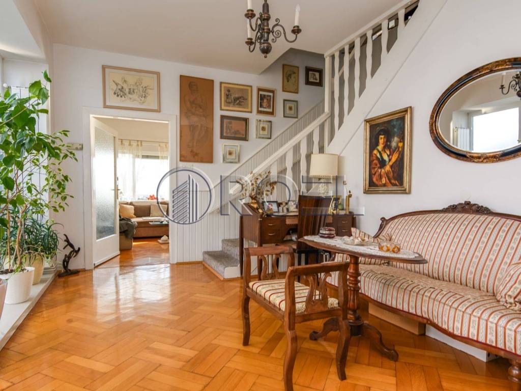Zagreb, Pantovčak, dvojni objekt, obiteljska kuća površine 380 m2 smještena na zemljištu 750 m2. Razvedena u četiri etaže:Prva etaža, prizemlje: u stan se ulazi iz vrta i sastoji se od: dnevnog boravka, kuhinje, kupaonice, spavaće sobe, garderobe i ostave.Druga etaža, visoko prizemlje: ulaz u kuću, predsoblje, veliki dnevni boravak s kuhinjom i blagovaonicom, s izlazom na terasu na kojoj je ostakljen zimski vrt, spavaća soba i kupaona.Treća etaža, prvi kat: Dvije spavaće sobe, kupaonica, te još jedna velika soba koja može biti i dnevni boravak s kuhinjom, balkon.Četvrta etaža, potkrovlje: dnevni boravak, kuhinja, kupaonica i dvije spavaće sobe. Kuća se vanjskim stubištem može odvojiti u 4 stana, ili ostaviti u izvornom stanju. Smještena je na izvrsnoj lokaciji i ima velik potencijal. Pred kućom postoji vanjsko parkirno mjesto za dva automobila dok je u dvorištu jedno natkriveno parkirno mjesto uz mogućnost parkinga za do maksimalno 6 vozila. Okućnica je uređena.Ova dvojna kuća nalazi se u jednoj od najatraktivnijih ulica u gradu Zagrebu, u elitnom naselju Pantovčak. Kuća je smještena na središnjem dijelu ulice Pantovčak i okružena je zelenilom. Lokacija je idealna za one koje žele mirno okruženje i istovremeno blizinu svih potrebnih sadržaja poput vrtića, osnovne škole, trgovina. Dječji vrtić je na minutu vožnje, osnovna škola na 2 minute vožnje a Britanski trg na svega 3 minute vožnje. Kuća je blago uvučena od glavne prometnice i pruža otvoren pogled na zelenilo.