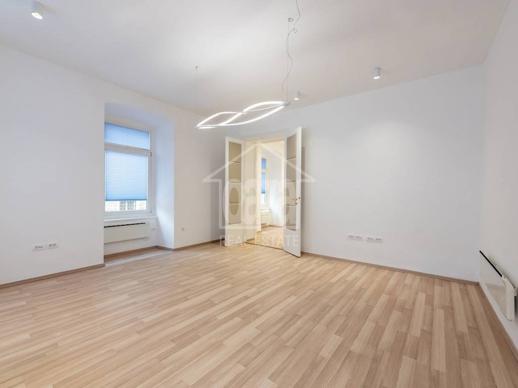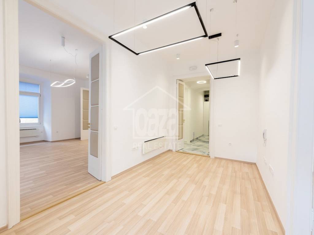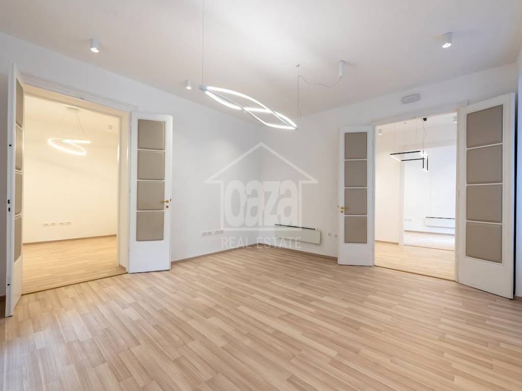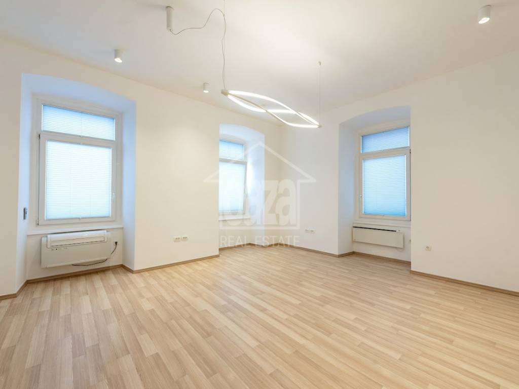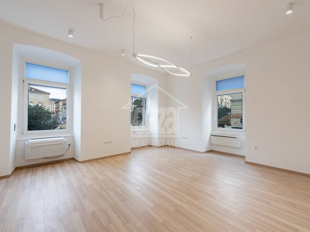 Iznajmljujemo ekskluzivan poslovni prostor od 87,02 m2 u očuvanoj austrougarskoj zgradi, na vrhunskoj lokaciji u samom centru Rijeke, odmah uz HNK Ivan pl. Zajc. Prostor se ističe visokim stropovima, obiljem prirodne svjetlosti te otvorenim pogledom na kazališni trg i fontanu, što mu daje dodatnu dozu reprezentativnosti i prestiža. Idealan je za djelatnosti koje traže ozbiljan poslovni dojam i atraktivnu lokaciju.