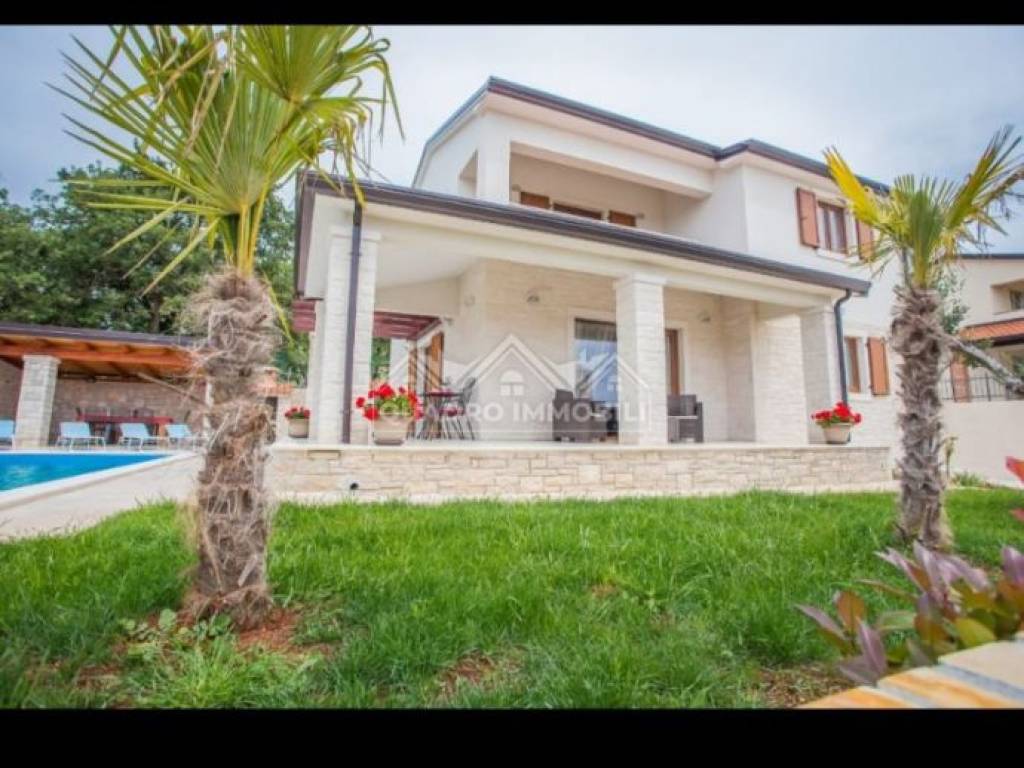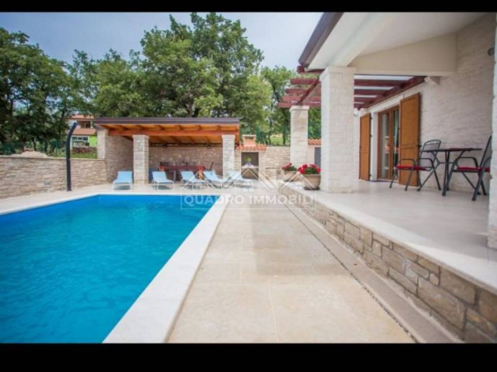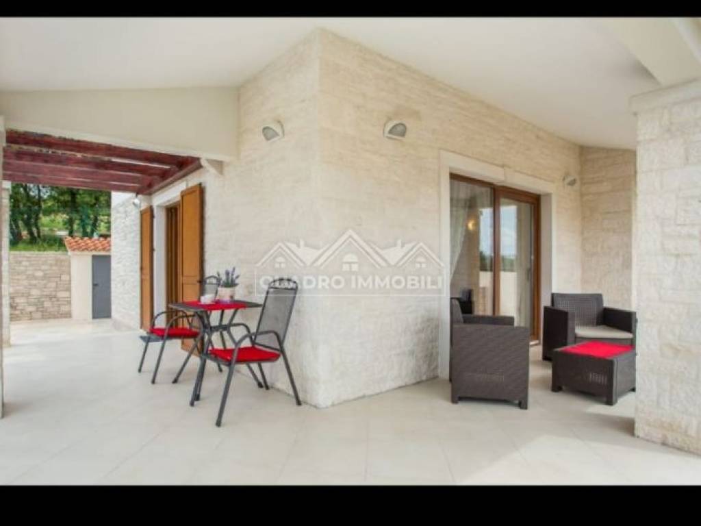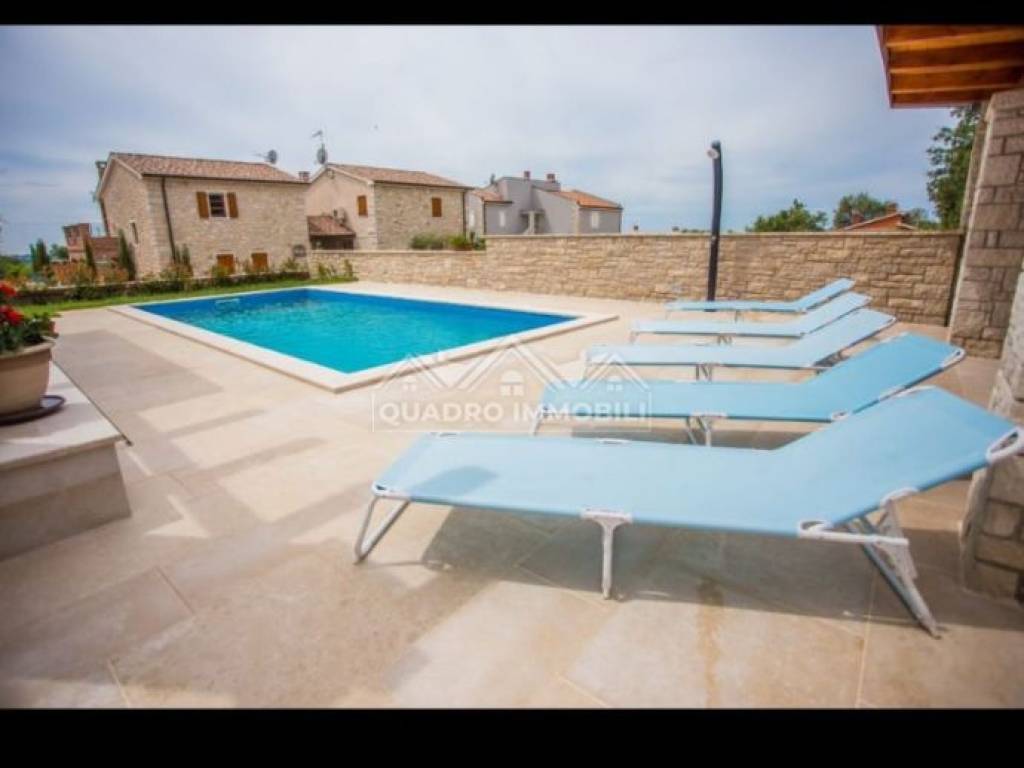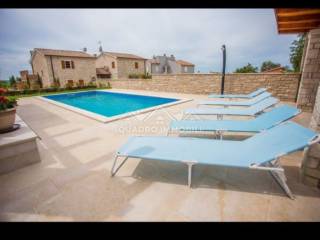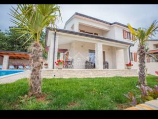 A beautiful villa with a swimming pool is for sale in a beautiful, quiet location in the Istrian town of Kaštelir. The house was built in 2018 and is made in a modern style with Istrian stone motifs. The house has an area of 180 m2 and a yard of 436 m2. The house has a ground floor and a first floor. On the ground floor there is a hallway that leads to the living room, dining room and kitchen, one bedroom and one bathroom. The stairs lead to the 1st floor where there are 2 bathrooms and 3 bedrooms. The house is made of high-quality carpentry, floors, bathrooms are with quality ceramics in a modern style, air conditioners are in the rooms for heating and cooling. In the landscaped yard there is a swimming pool and a covered terrace of 40 m2 for enjoying with a sea view. In the yard there is parking for 2-3 cars. The house is 10 km from Poreč.