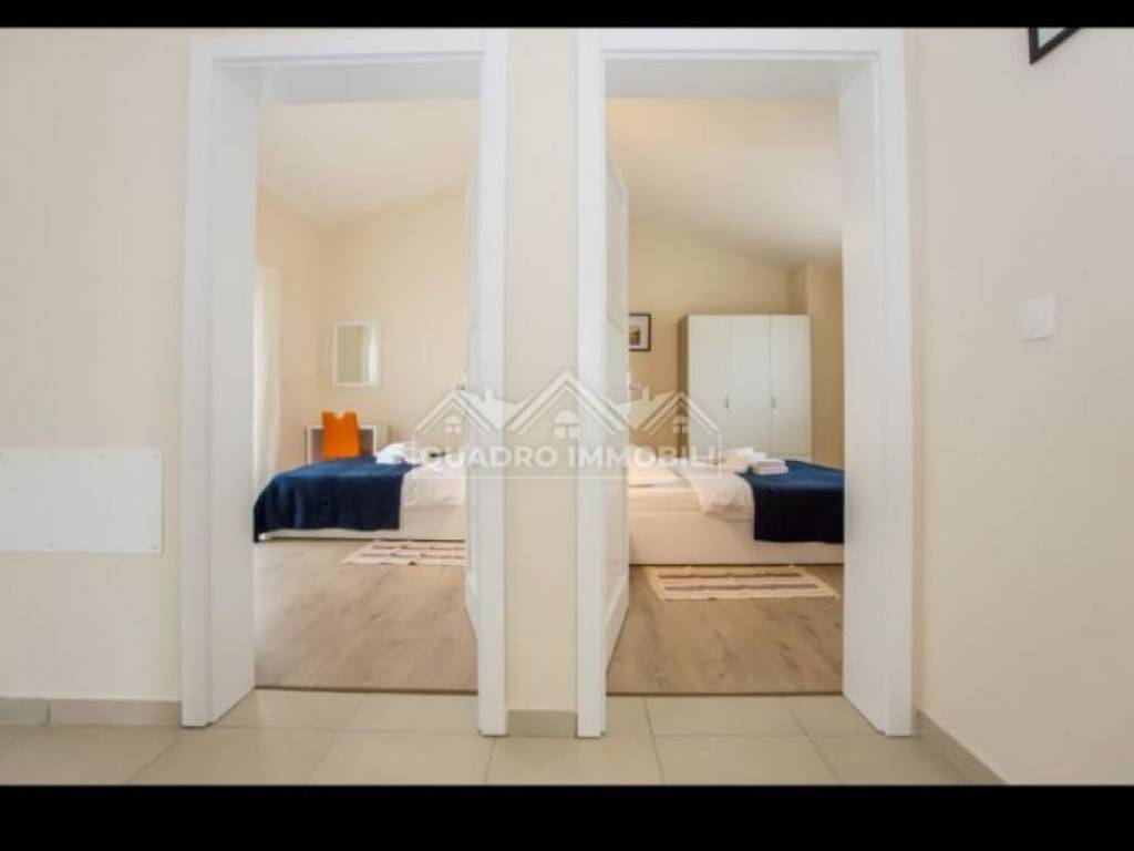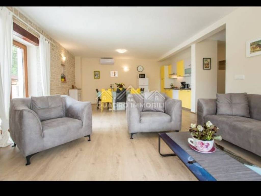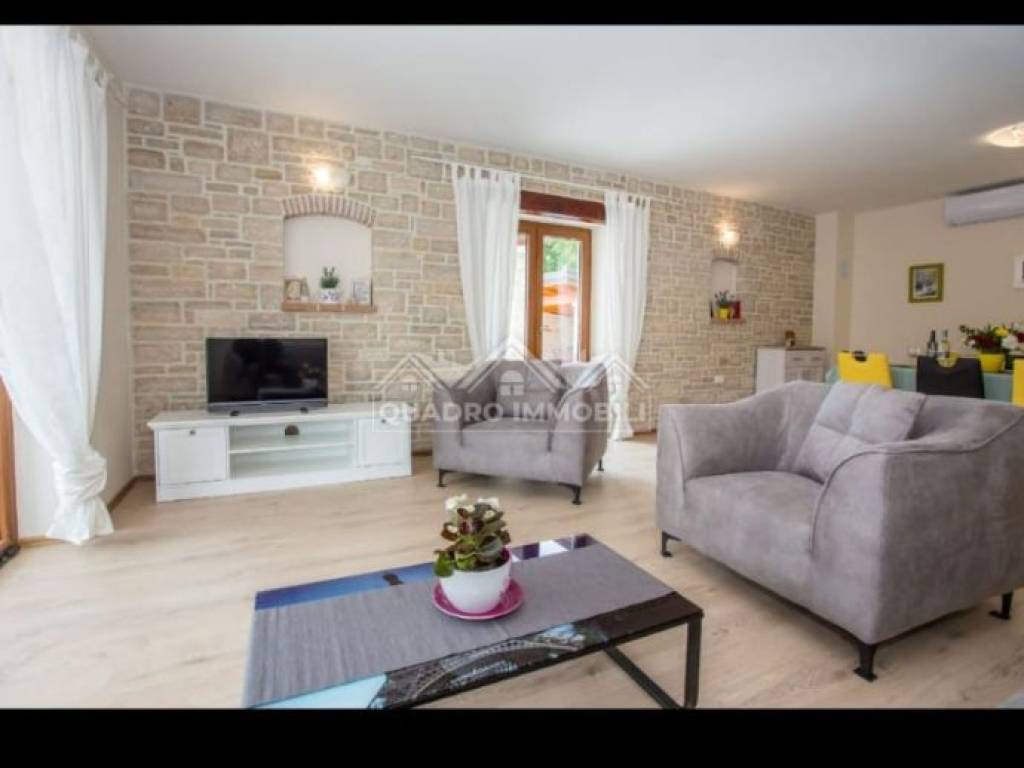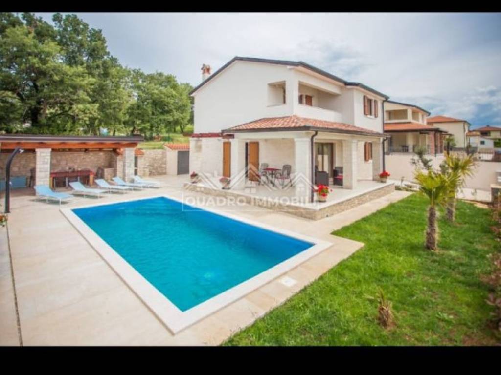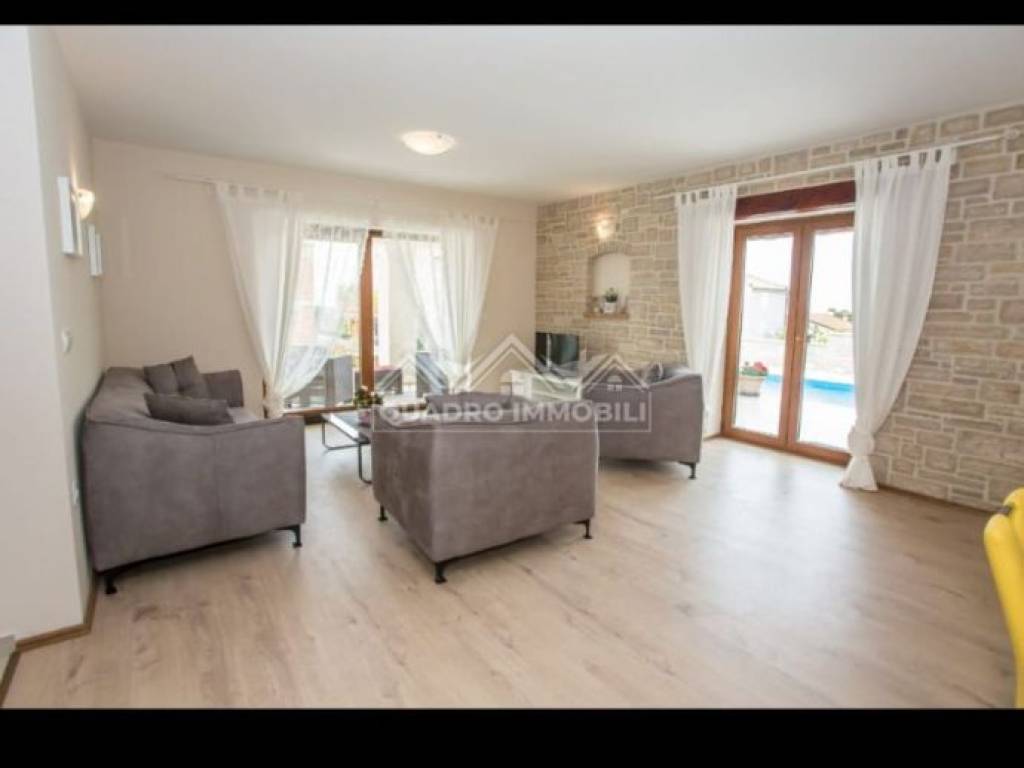 A beautiful villa with a swimming pool is for sale in a beautiful, quiet location in the Istrian town of Kaštelir. The house was built in 2018 and is made in a modern style with Istrian stone motifs. The house has an area of 180 m2 and a yard of 436 m2. The house has a ground floor and a first floor. On the ground floor there is a hallway that leads to the living room, dining room and kitchen, one bedroom and one bathroom. The stairs lead to the 1st floor where there are 2 bathrooms and 3 bedrooms. The house is made of high-quality carpentry, floors, bathrooms are with quality ceramics in a modern style, air conditioners are in the rooms for heating and cooling. In the landscaped yard there is a swimming pool and a covered terrace of 40 m2 for enjoying with a sea view. In the yard there is parking for 2-3 cars. The house is 10 km from Poreč.