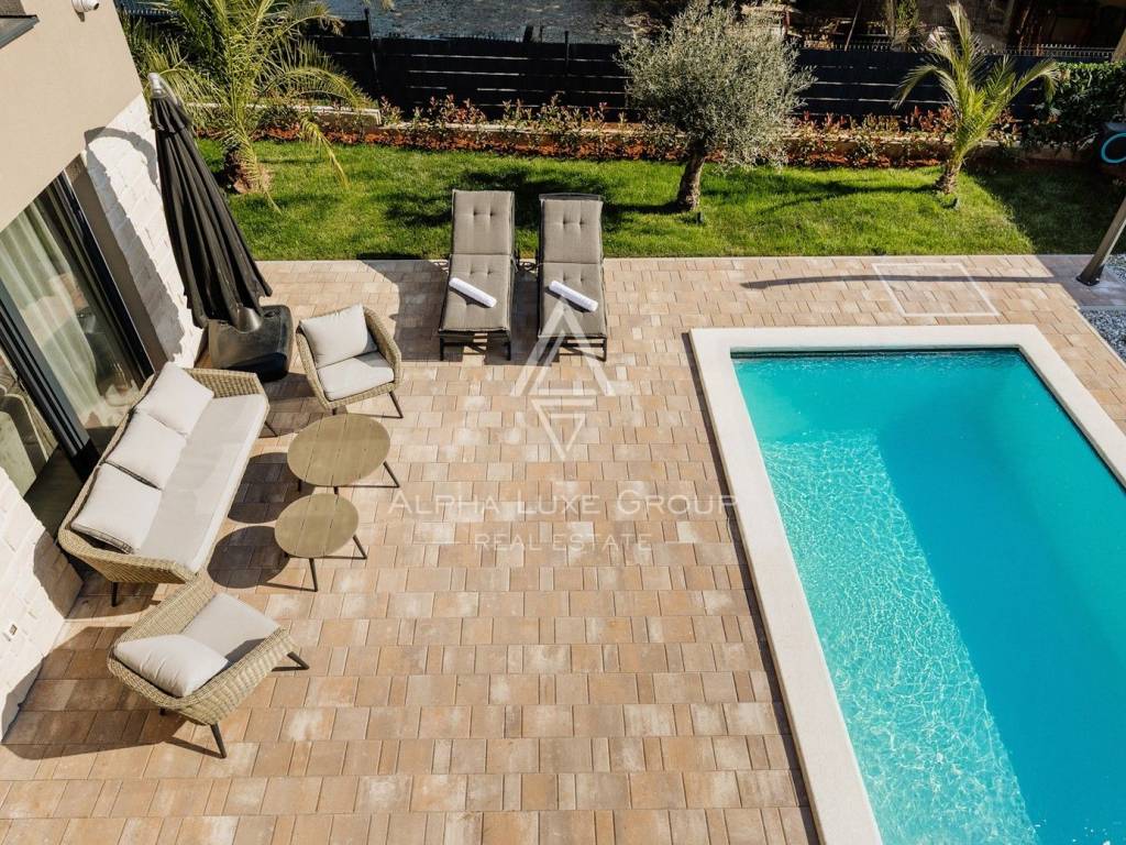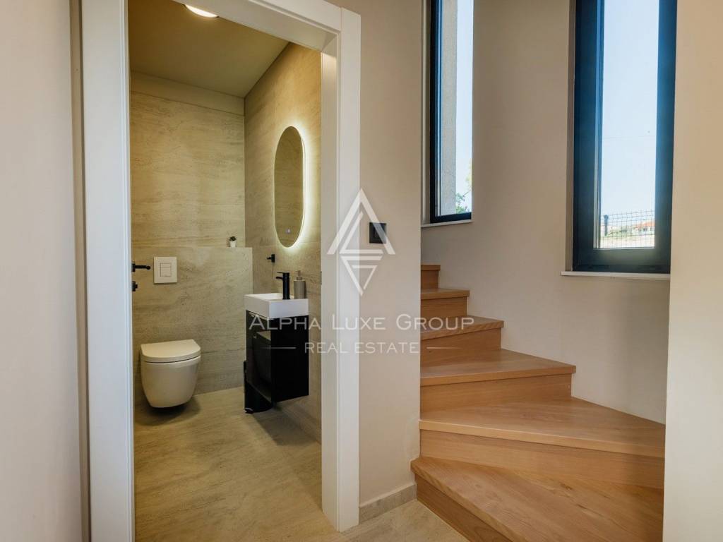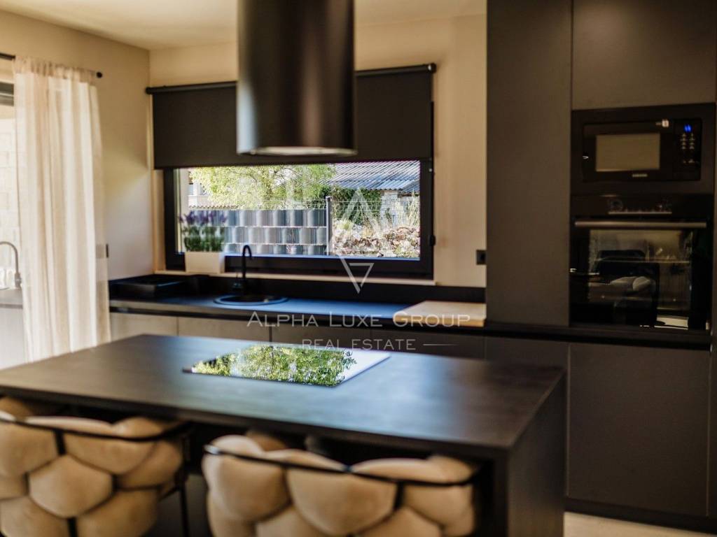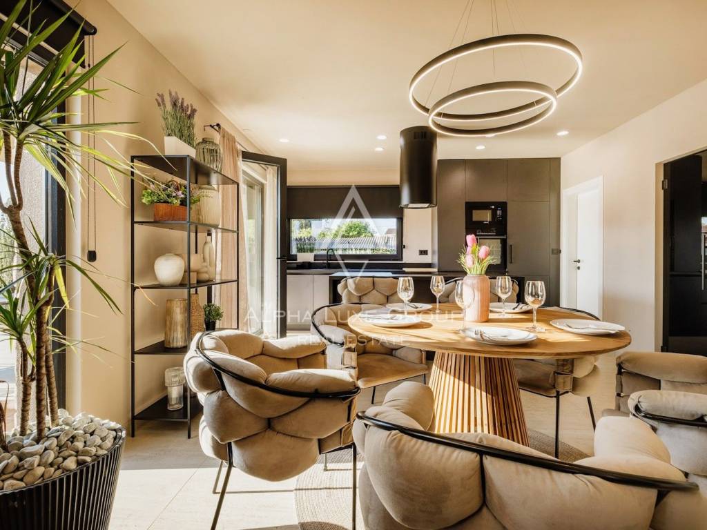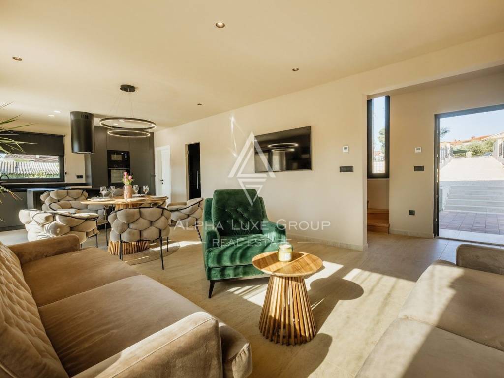 La casa si sviluppa su due livelli con una superficie abitabile totale di circa 170 m2, comprese le terrazze, ed è situata su un terreno curato di 540 m2. Al piano terra si trovano un ingresso, un luminoso e spazioso soggiorno con accesso diretto a una grande terrazza di 32,75 m2, un bagno di servizio, una cantina per vini e un locale tecnico. Al piano superiore si trovano tre confortevoli camere da letto e due bagni, tra cui una camera padronale con bagno privato e accesso a una terrazza coperta.