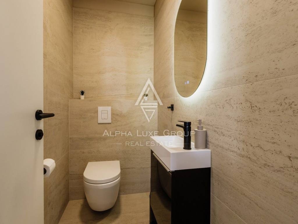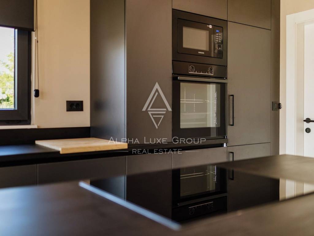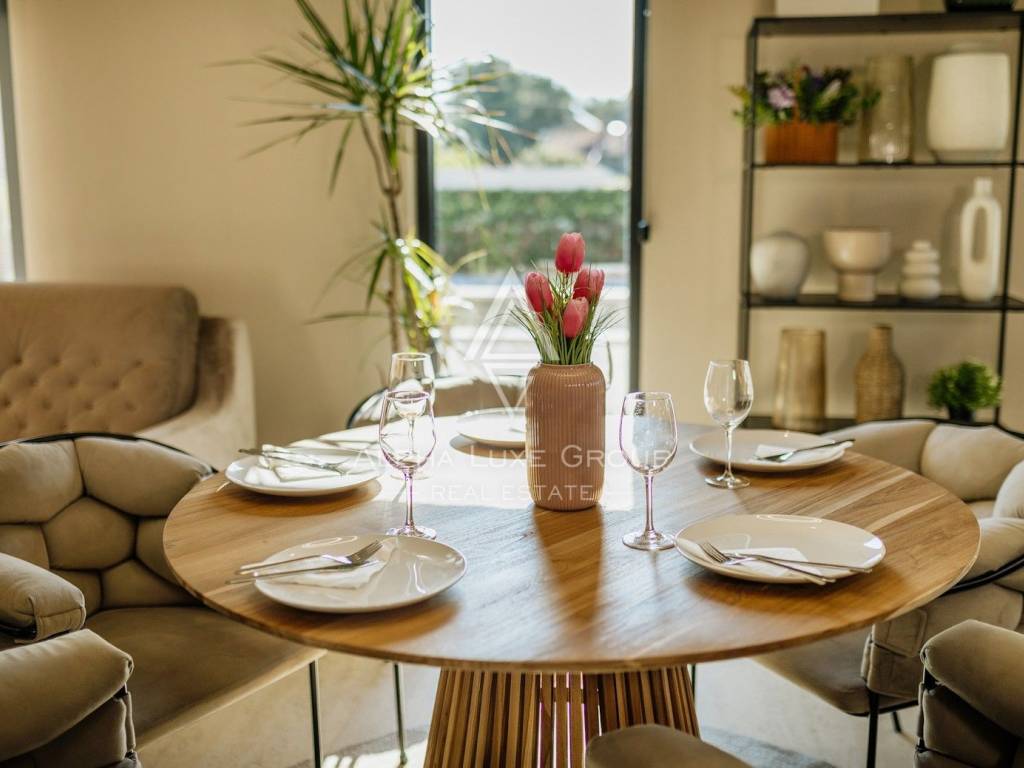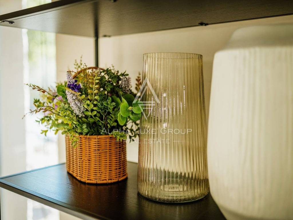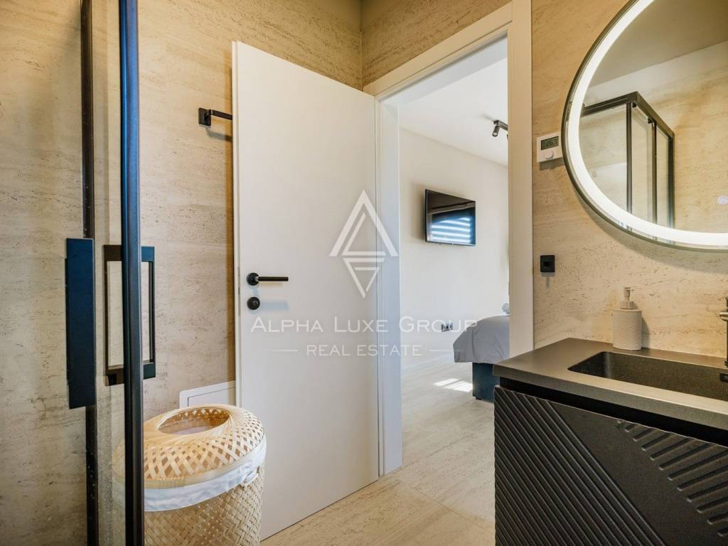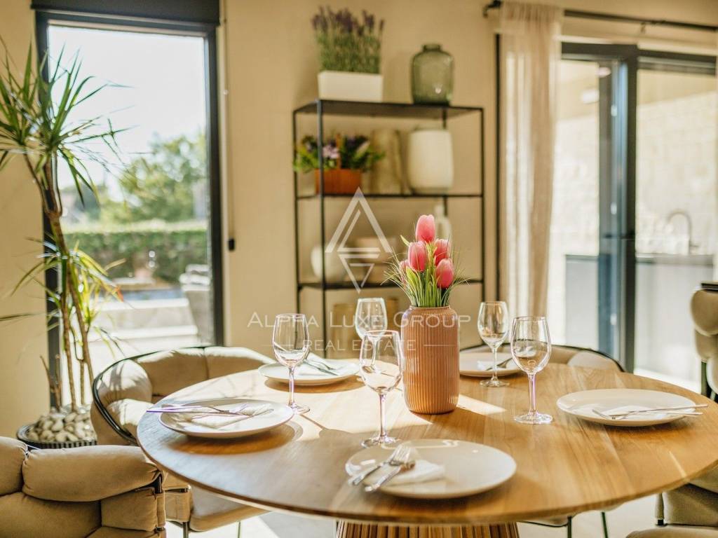 La casa si sviluppa su due livelli con una superficie abitabile totale di circa 170 m2, comprese le terrazze, ed è situata su un terreno curato di 540 m2. Al piano terra si trovano un ingresso, un luminoso e spazioso soggiorno con accesso diretto a una grande terrazza di 32,75 m2, un bagno di servizio, una cantina per vini e un locale tecnico. Al piano superiore si trovano tre confortevoli camere da letto e due bagni, tra cui una camera padronale con bagno privato e accesso a una terrazza coperta.