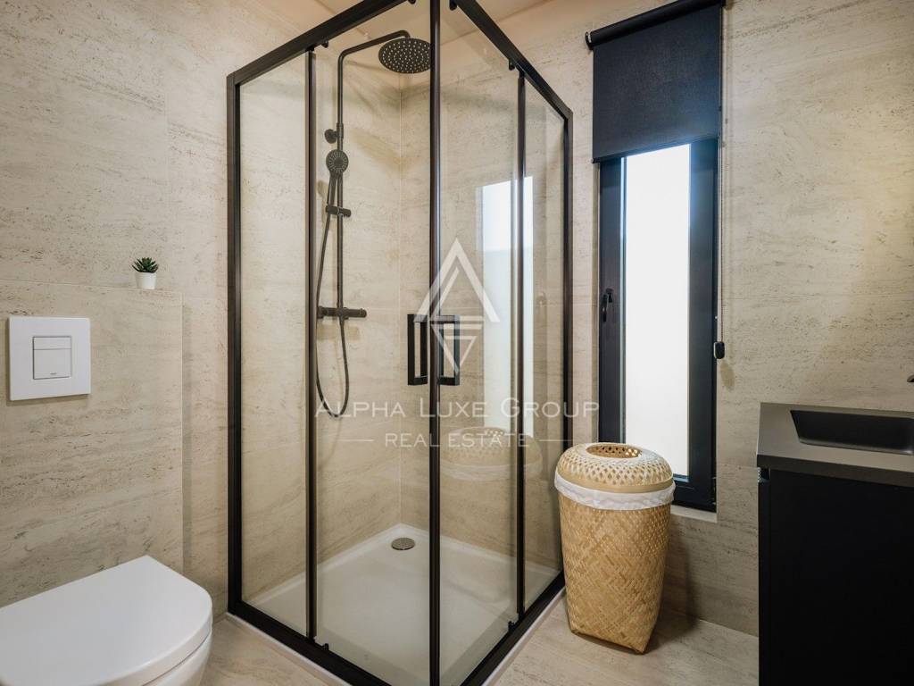 L’area esterna è curata nei minimi dettagli con vegetazione mediterranea, una piscina e posti auto privati. Gli infissi in PVC di alta qualità in colore antracite sono dotati di zanzariere e tapparelle elettriche, mentre le dotazioni aggiuntive includono un sistema di sicurezza con allarme e videosorveglianza. Il riscaldamento e il raffrescamento sono gestiti in modo efficiente tramite aria condizionata e pompa di calore.