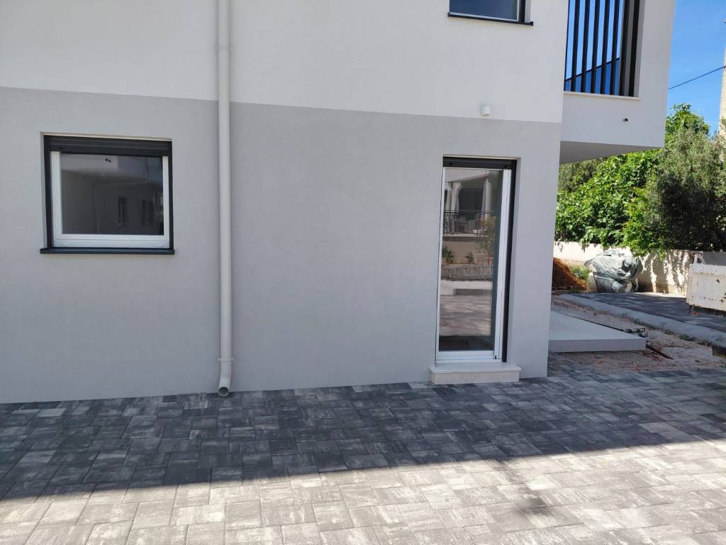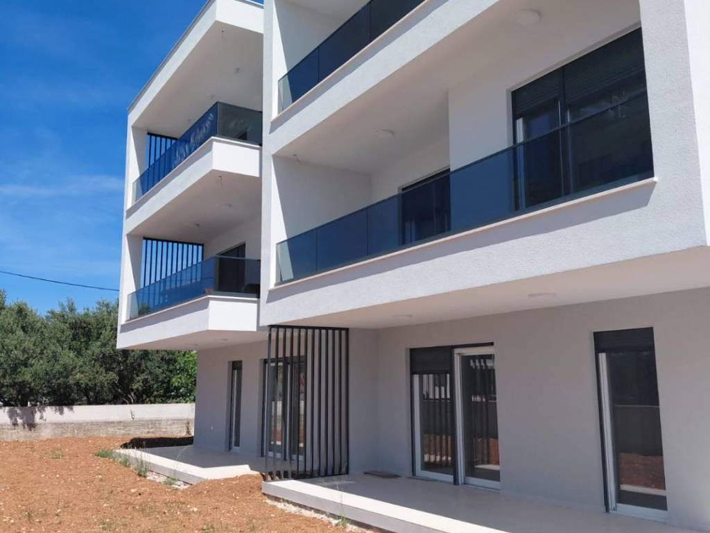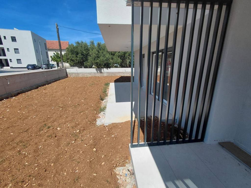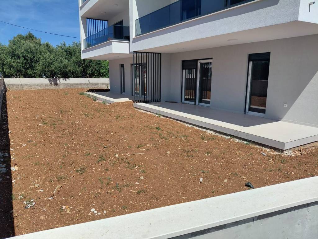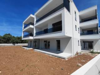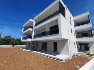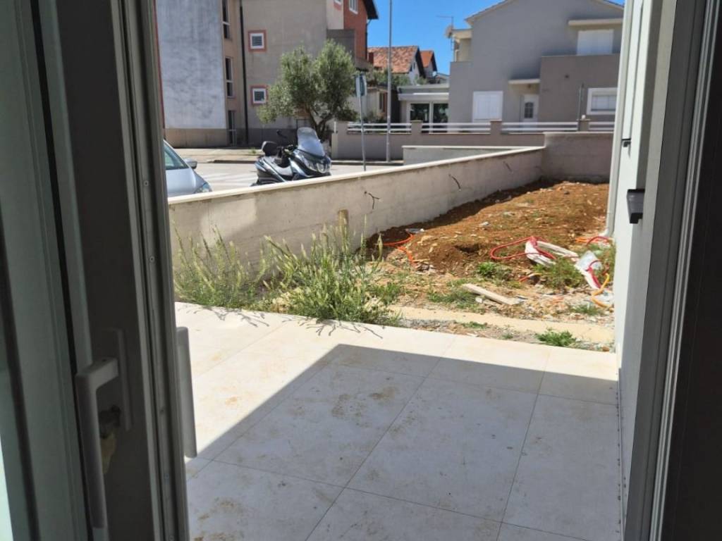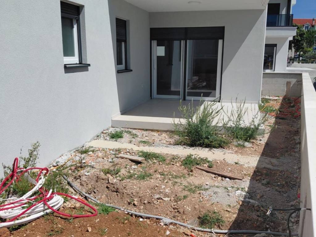 On an excellent location in Vodice, near Hangar Beach, a ground-floor apartment in a newly built building is for sale. The apartment is located on the southwest side of the building and consists of an entrance area, one bedroom, a bathroom, and a spacious living area with access to a covered terrace, which further leads to a private green garden area.