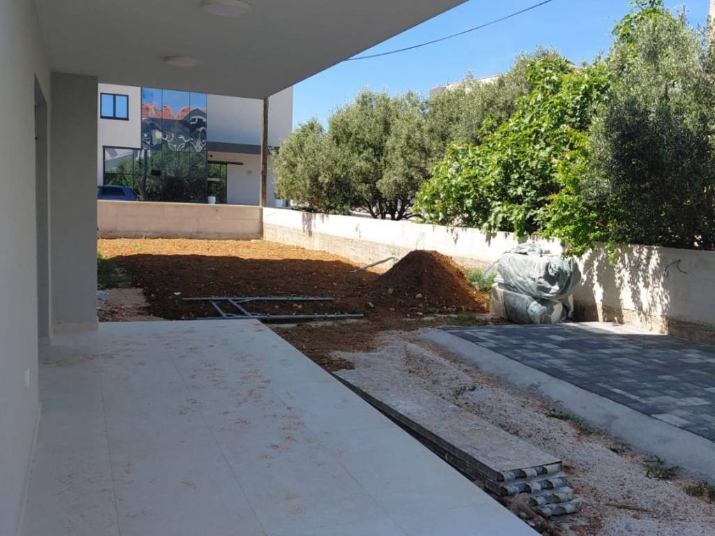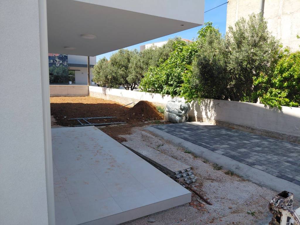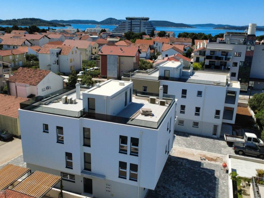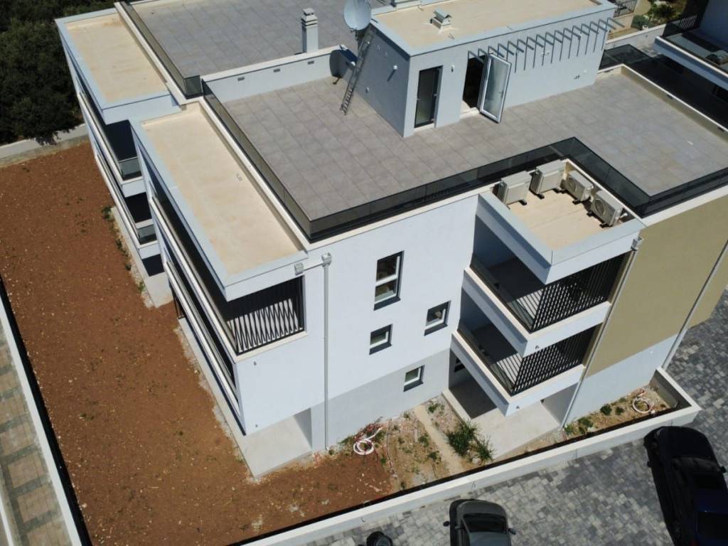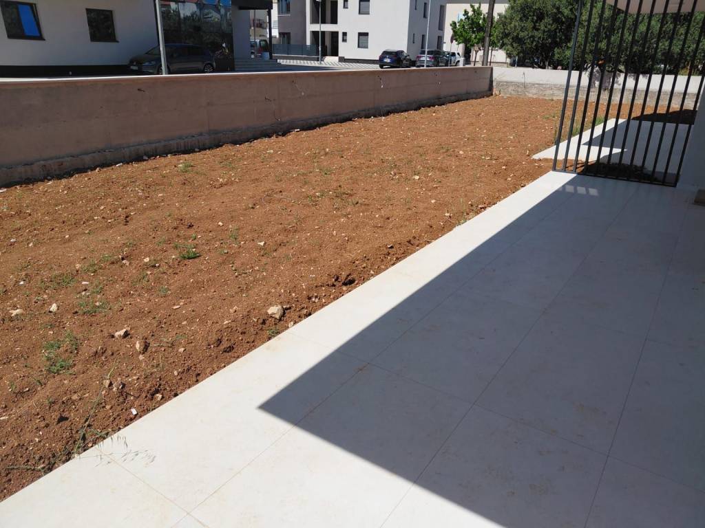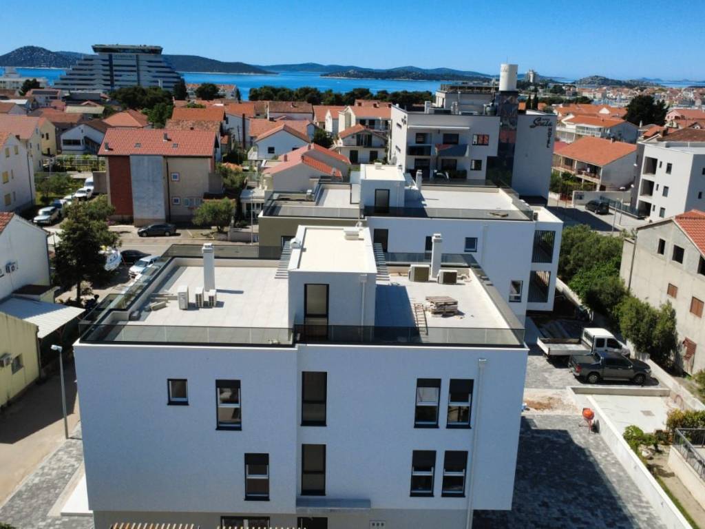 On an excellent location in Vodice, near Hangar Beach, a ground-floor apartment in a newly built building is for sale. The apartment is located on the southwest side of the building and consists of an entrance area, one bedroom, a bathroom, and a spacious living area with access to a covered terrace, which further leads to a private green garden area.