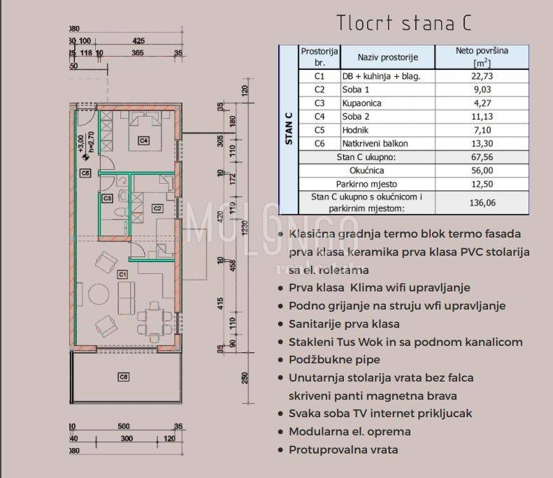 L'appartamento è composto da un soggiorno, cucina, zona pranzo, due camere da letto, bagno, corridoio e una terrazza coperta. L'appartamento ha una superficie di 67,56 m², con un giardino di 56 m² e un posto auto di 12,50 m².