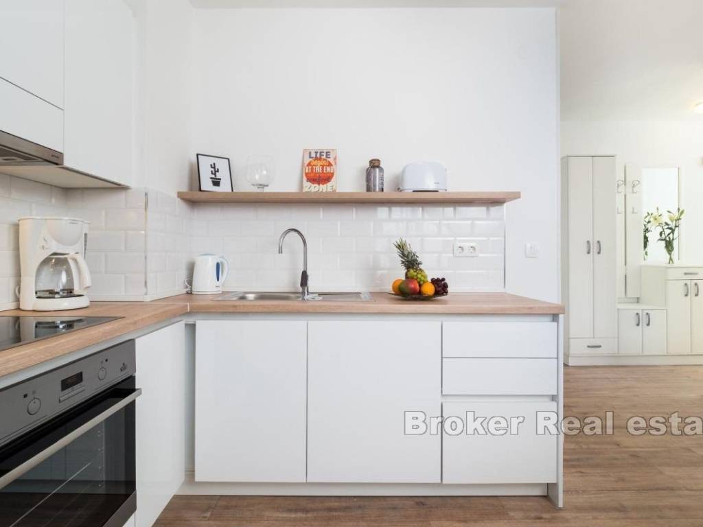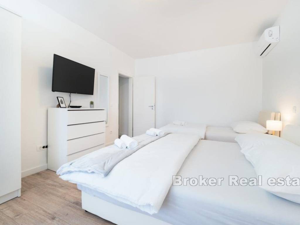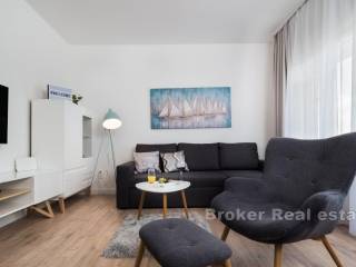 A beautiful, fully furnished apartment located in the first row to the sea offers a spectacular view of the sea and the enchanting town of Trogir. With a living area of 63 m², it was originally a two-bedroom apartment but has been thoughtfully converted into a spacious one-bedroom unit, making it ideal for tourism purposes. The apartment has been elegantly and fully renovated, exuding modern luxury through its sophisticated design. The apartment comprises a spacious and bright bedroom, a modernly equipped bathroom, a functional kitchen with a dining area, and a large, sunny living room with access to a generous balcony. The balcony is the perfect spot to enjoy the breathtaking views of the azure sea and the picturesque town of Trogir. Thanks to its premium location, the apartment offers close proximity to all essential amenities, making it ideal for both tourist rentals and comfortable year-round living. This property perfectly combines comfort, functionality, and aesthetic appeal, making it a true gem on the market.