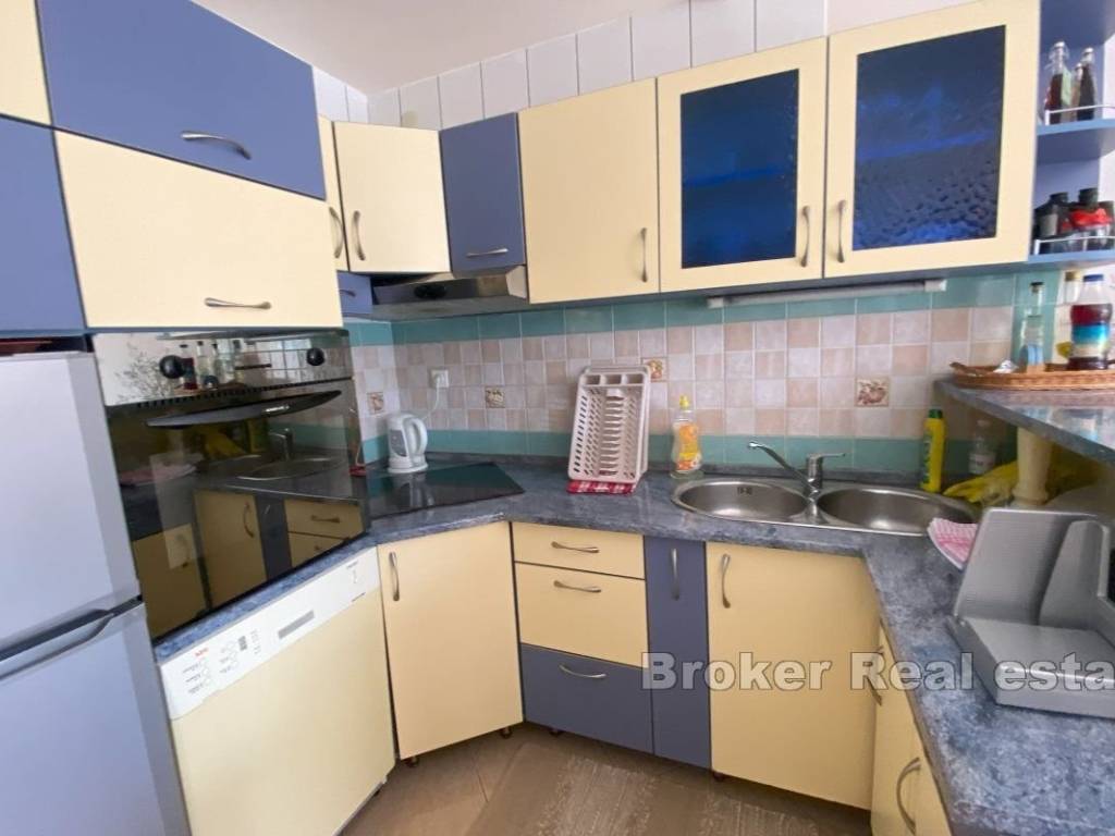 Apartment house located right on the beach by the Novigrad Sea. The house is in the first row to the sea and offers an open and beautiful view of the sea and the Velebit mountain.   On the ground floor of the house, there is a hospitality facility with a courtyard. This facility has not been operational for some time and requires renovation if you are interested in continuing its operation. External stairs lead to the first floor, where there is a spacious two-bedroom apartment with a large terrace. The external stairs also lead to the second floor, which houses two one-bedroom apartments (each 32 m2) with their own terraces. The house was renovated in 2021, including a new thermal facade, a new Mediterranean tile roof, and a new metal roof on the courtyard room.   The location is peaceful, 40 minutes from Zadar Airport and 40 minutes from Paklenica National Park. The towns of Benkovac and Novigrad are 15 km away.