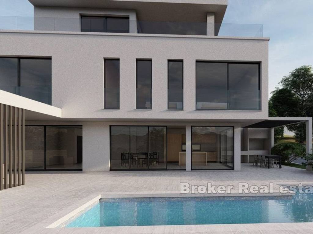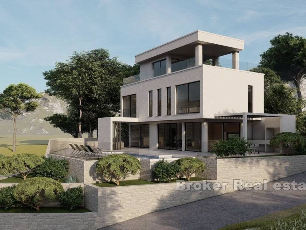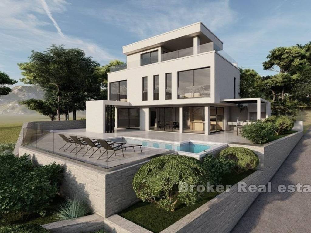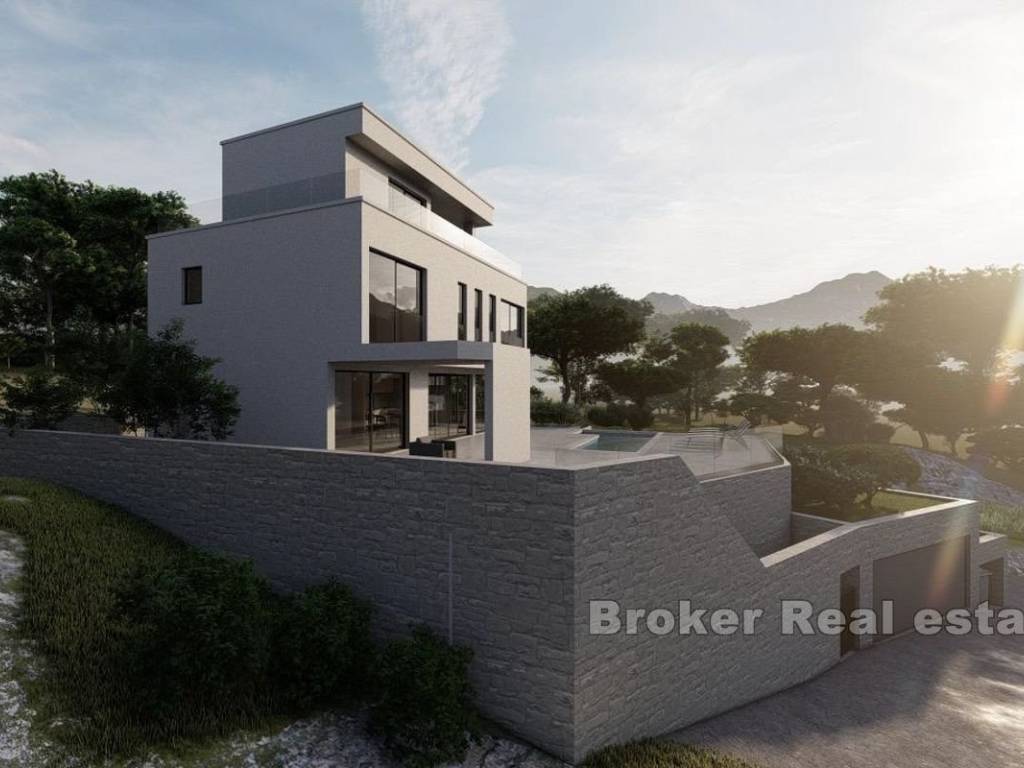 A modern villa under construction is for sale in a quiet location in an area of the village where surroundings consist of nature and well planned villas. The villa itself offers a view of the sea and nature. The finished villa will have about 320 m2 across 4 floors, built on a plot of land with a total area of 467 m2, which also has an outdoor fireplace, summer kitchen, swimming pool and a garage for 2 cars. Basement is 67 m2, and its used as multifuncional space. The ground floor (98 m2)consists of a living room, dining room, kitchen, toilet and laundry room. From the living room enters onto a spacious terrace with a 24 m2 swimming pool and a summer kitchen. On the first floor (80 m2) there are 3 bedrooms with 3 bathrooms, each facing the sea. On the second floor (74 m2) there is area (15 m2) that can be either a bedroom, a room for relaxastion or a multifunctional room with a large covered terrace (31 m2) and uncovered terrace (27 m2). Characteristics worth mentioning are certainly that the villa will be equipped with central management and supervision, and the great advantage of this investment is that the entire concept is planned in agreement and by the wishes of the owner.