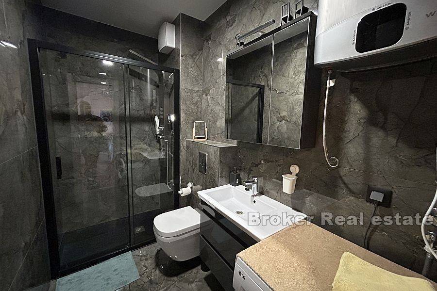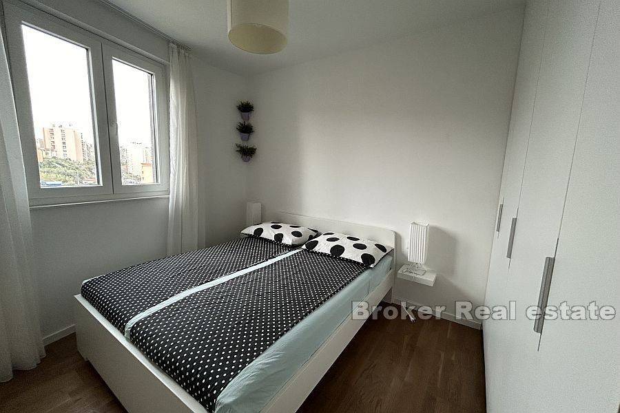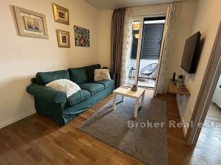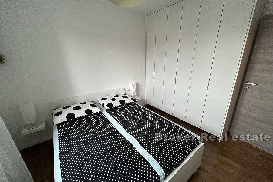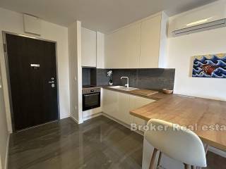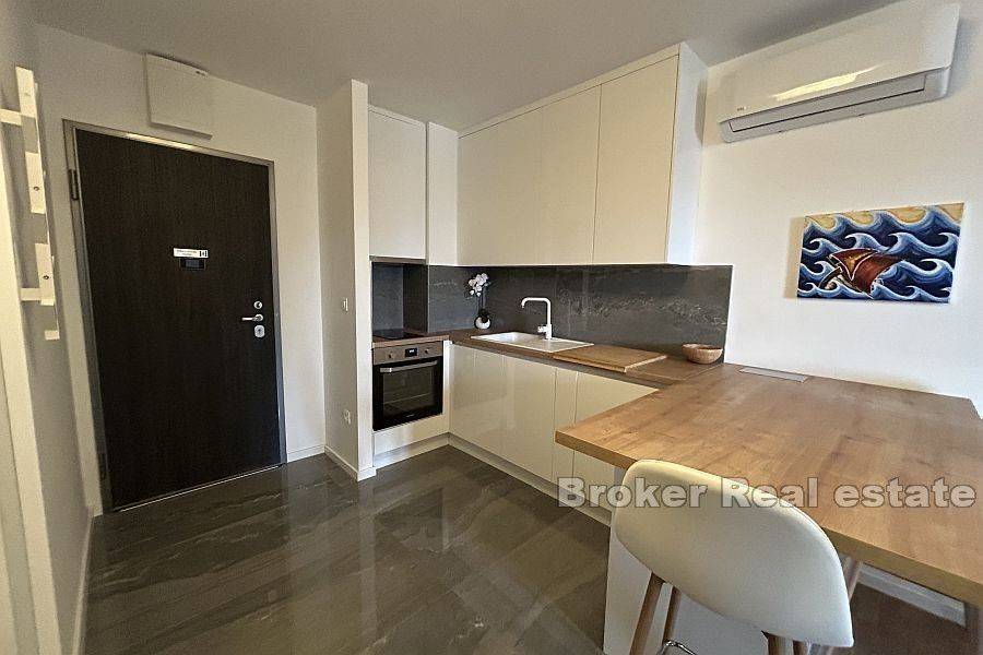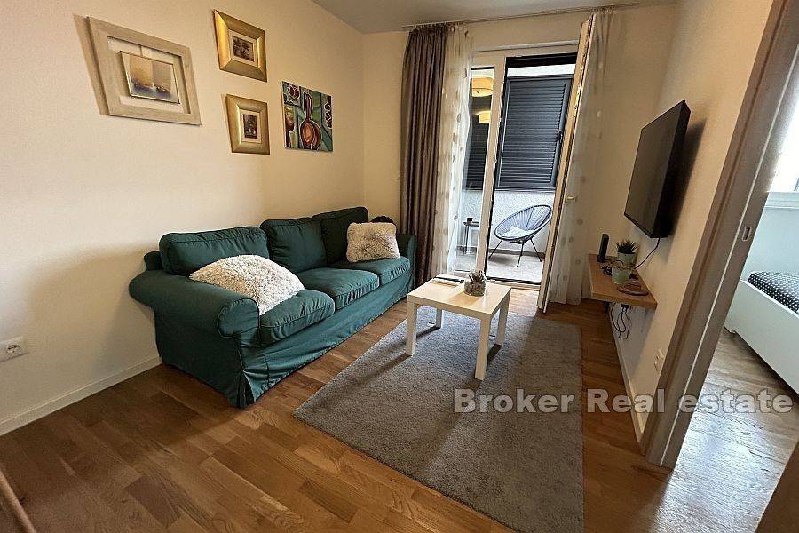 A modern one-room apartment for sale in a functional location, with a total living area of 36 m2. The apartment is located on the 5th floor of a building with an elevator, which is also the last floor. It consists of a kitchen with a dining room that opens onto a terrace, a bedroom and a bathroom. This property has a garage space that is included in the price. The building is equipped with top-quality materials, and the apartment itself with custom-made luxury furniture. It is an ideal investment opportunity due to its excellent location, which means that it can be used for tourist rental as well as for housing. This property is located in the immediate vicinity of all important amenities such as a shopping center, school, kindergarten, restaurants, and the city center is about 10 minutes away by car.