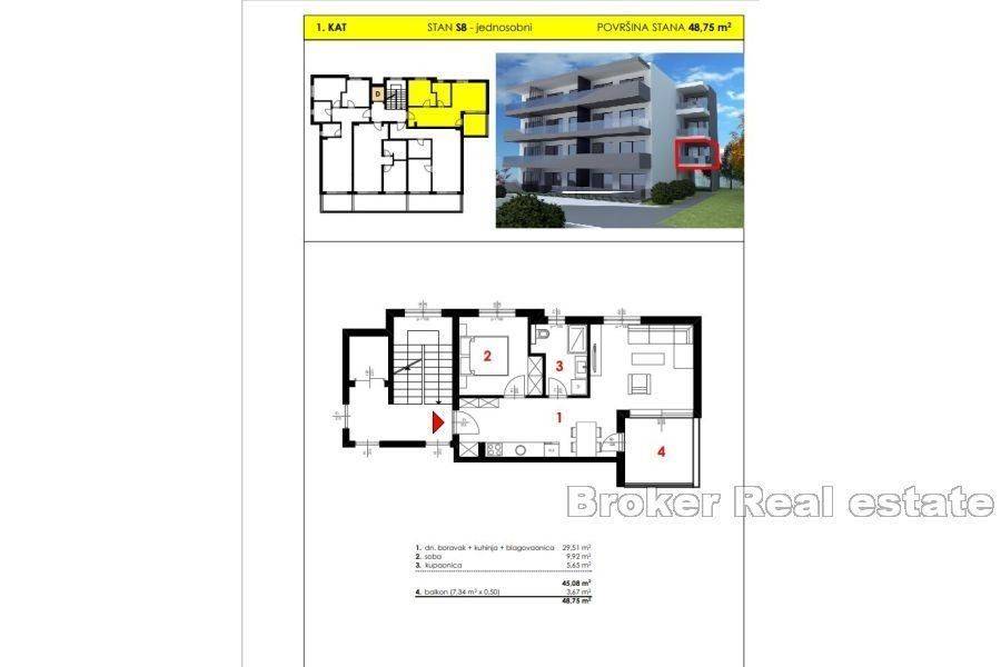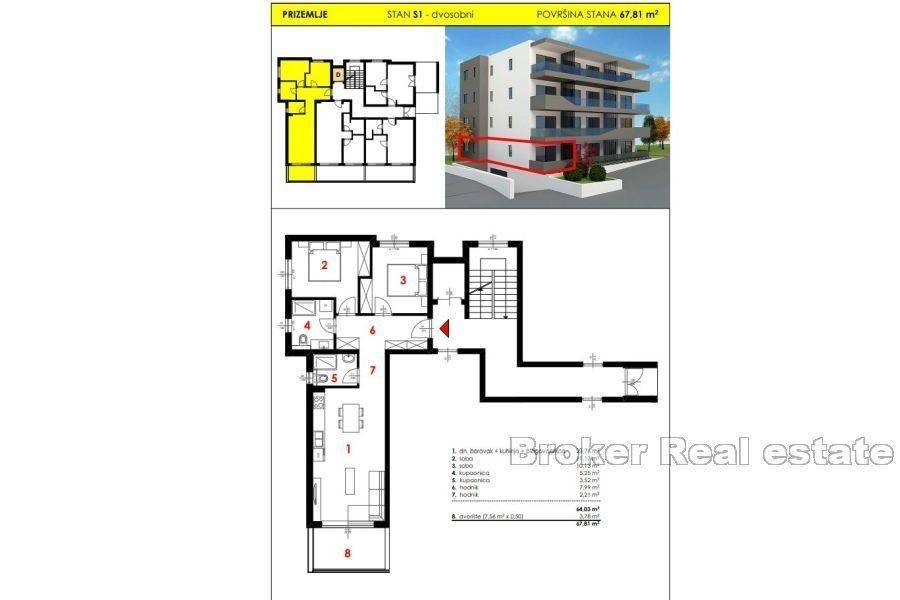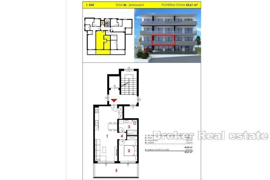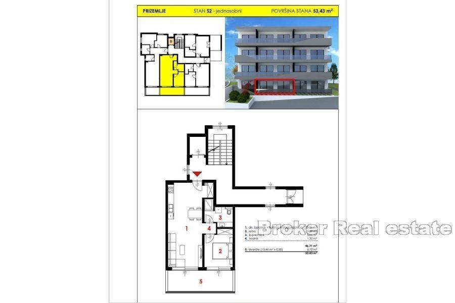 Modernly designed apartments under construction, with sea views, for sale, located in the southern part of the Makarska Riviera, in a quiet and elegant position near the sea.   The buildings have 5 floors; basement, ground floor and three floors. The basement is planned as a garage for 11 cars, while the upper floors are for residential purposes. On each floor, one two-bedroom and three one-bedroom apartments are planned.   The two-bedroom apartments are located approx. They are 68 m2 in size and have 2 bathrooms, while the one-bedroom apartments range in size from 40 m2 to 59 m2, as shown in the list below.   All apartments have a balcony, and all floors except the ground floor have a sea view. The ground floor apartments have outdoor parking spaces (5).   Given the potential of the microlocation and the quiet neighborhood, yet at a very short distance from the beach and the center of the village with accompanying amenities, this offer represents a very interesting investment in an apartment-type property on the Makarska Riviera.   The Makarska Riviera, as one of the most beautiful areas of the Adriatic, with idyllic pebble beaches, fragrant pine forests and the beautiful Biokovo mountain, offers a perfect blend of nature that will not leave anyone indifferent.   Apartments:   Building 1 : S2 ground floor – 53.43 m2 – 197,691 eur Building 2 : S7 first floor – 72.57 m2 – 297,573 eur   The price of an outdoor parking space is 10,000 euros.