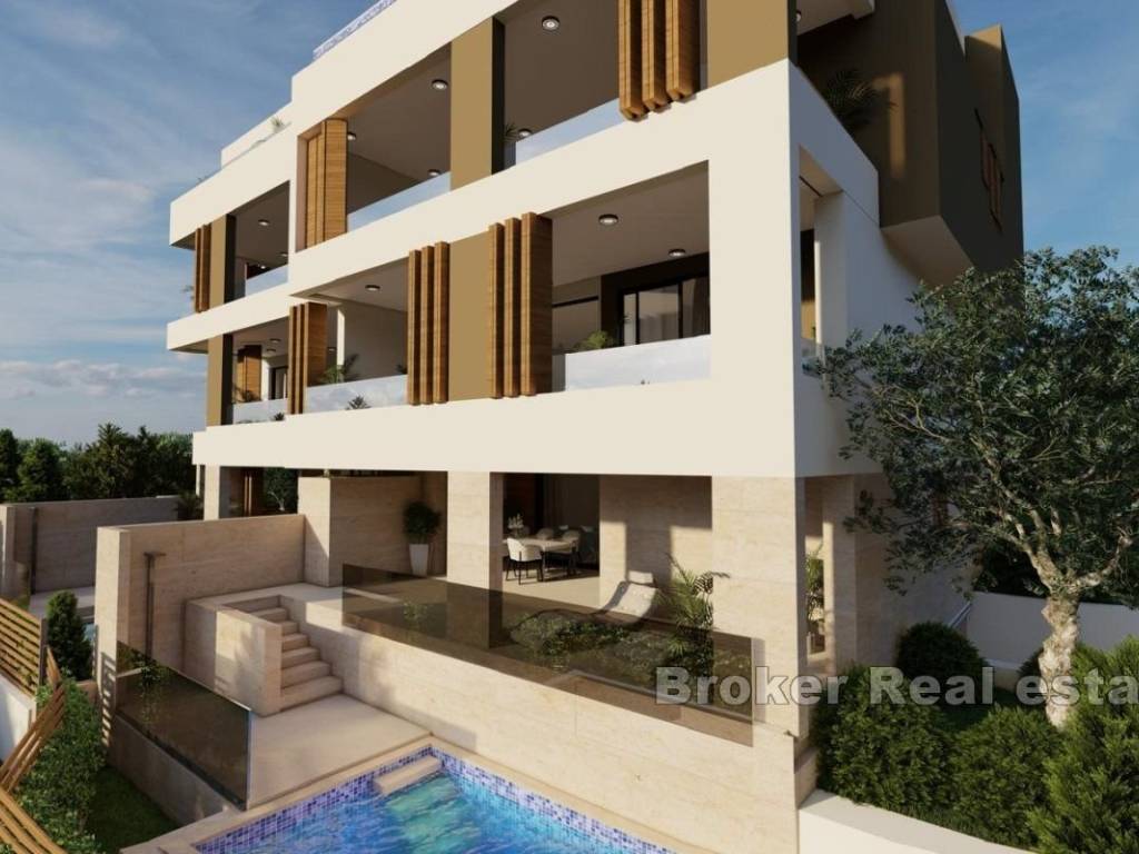 Luxury apartments in a new building in an attractive location. The building contains a total of seven apartments, each of which has its own garage and outdoor parking space. All apartments have a large floor plan and are modernly designed for a comfortable life. S1- 530.000 € Apartment on the ground floor with a total of 128 m2 of living space. It consists of a spacious main living space that includes a living room, kitchen, and dining room. In addition, it contains two rooms, two bathrooms, and a loggia that is connected to the garden where a swimming pool is planned. The apartment has a storage room, a garage, and an outdoor parking space. S2- 560.000 € Apartment on the ground floor with a total of 134 m2 of living space. It consists of a spacious main living space that includes a living room, kitchen, and dining room. In addition, it contains two rooms, two bathrooms, a guest toilet, and a loggia that is connected to the garden with a swimming pool. The apartment has a storage room, a garage, and an outdoor parking space. S3- 620.000 € The apartment on the first floor with a total of 113 m2 of living space. It consists of a spacious main living space that includes a living room, kitchen, and dining room. In addition, it contains two rooms, two bathrooms, a guest toilet, and a loggia that is connected to the garden with a swimming pool. The apartment has a storage room, a garage, and an outdoor parking space. S4- 590.000 € The apartment on the first floor with a total of 101 m2 of living space. It consists of a spacious main living space that includes a living room, kitchen, and dining room. In addition, it contains two rooms, two bathrooms, a guest toilet, and a loggia that is connected to the garden with a swimming pool. The apartment has a storage room, a garage, and an outdoor parking space. S5- SOLD S6- 680.000€ The apartment on the second floor of a total of 102 m2. It consists of a spacious main living space that includes a living room, kitchen, and dining room. In addition, it also contains three bedrooms, two bathrooms, a guest toilet, and a loggia with a view of the sea. The apartment has a storage room, a garage, and an outdoor parking space. S7- 1.250.000 € Penthouse with a total of 205 m2 of living space. It consists of a spacious main living space that includes a living room, kitchen, and dining room. It also contains three bedrooms, two bathrooms, and a guest toilet. and a loggia with a view of the sea. The loggia leads to a large terrace where there is a space for relaxation, including a jacuzzi. The apartment has a storage room, a garage, and an outdoor parking space. The building is located in an excellent location, suitable for both living and tourist business. The distance from the nearest beaches and the city center is only a 10-minute walk. The airport is a 40-minute drive away. Construction has begun and completion is planned by the end of 2025
