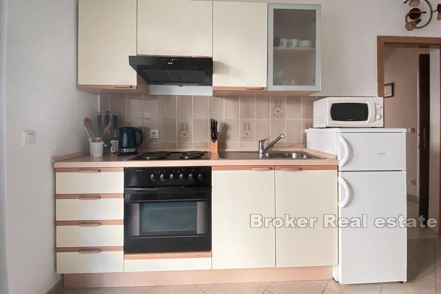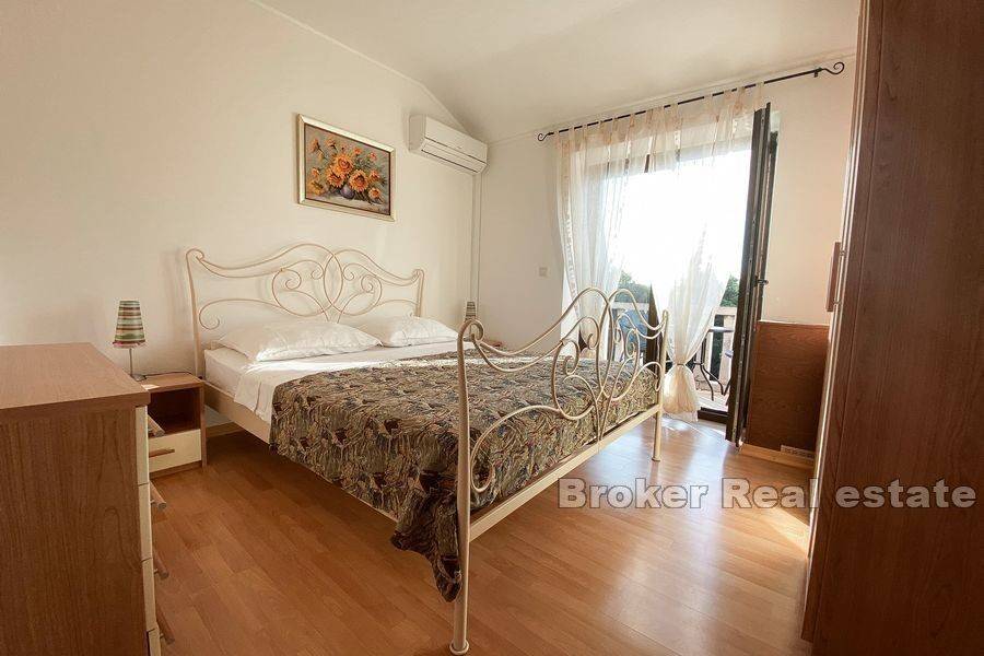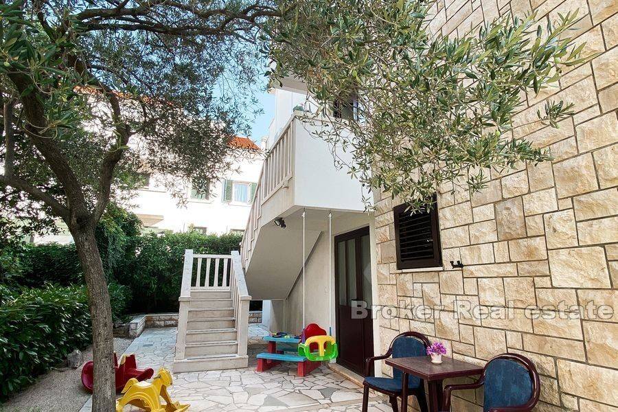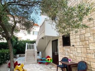 Apartment house in the center of town and near the sea on the island of Brač. The house consists of three floors, each floor with a separate entrance. On the first floor there is a spacious apartment of 125 m2 consisting of two bedrooms, two bathrooms, kitchen, fireplace, separate dining room with access to the terrace. The apartment has two separate entrances. There are three apartments on the second floor. Two apartments of 30 m2 with one bedroom, bathroom and a small hallway connected to the kitchen and terrace. The third apartment has an area of 45 m2 and consists of one bedroom with access to its own balcony, one bathroom and a kitchen with access to its own balcony. On the third floor there are two separate apartments with a separate entrance. One apartment has an area of 45 m2 and consists of two bedrooms, a separate kitchen, a hallway, a bathroom and two balconies with exits from both the bedroom and the kitchen. The second apartment has an area of 60 m2 and consists of two bedrooms, separate kitchen, hallway, bathroom and three balconies with exits from each bedroom and kitchen. The property also has an auxiliary room where two additional washing machines are located. It is for sale furnished and has a garage with an automatic door and remote control. The spacious cultivated garden is decorated with Mediterranean plants, outdoor furniture, compost and children’s content. An attractive offer is the walking distance from the beach and all necessary facilities for living, as well as the possibility of continuing the tourist business.