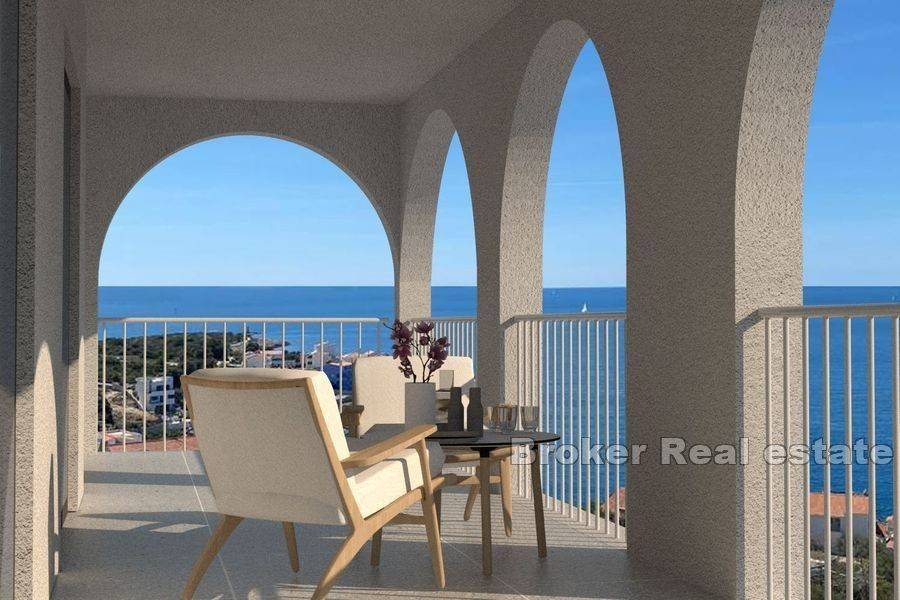 Detached house with sea view. Beautiful detached house located in the central part of the Croatian coast, between Split and Sibenik, in a small tourist place near Rogoznica. It was built on a plot of 460 m2, total living area of ​​500m2. And it consists of a basement, ground floor, first floor and attic. On the basement floor there is a garage with a total area of ​​210m2 and an additional water tank. On the ground floor there is a living space of 94m2, consisting of four bedrooms, two bathrooms, spacious living room and kitchen with access to a spacious open terrace of 210m2, which can be further enriched with facilities such as swimming pool, jacuzzi, sun deck And similar. On the first floor there is a living space with a total area of ​​94m2, which also consists of four bedrooms, two bathrooms, spacious living room and kitchen. Each bedroom and living room have access to a terrace with beautiful sea views. On the attic floor there is a living space with a total area of ​​94m2, and consists of two bedrooms, two bathrooms and a spacious living room with kitchen, which has access to a terrace of 54m2. The view from each floor and especially the attic is impressive. The price of the house includes a neighboring plot with a total area of ​​470m2 which provides various possibilities such as the construction of a swimming pool, sports field, yard, additional parking and the like. Apart from the fantastic view, the biggest advantage of this property is the privacy provided because the house was built on top of a hill where the urban plan or construction zone ends. Near the house there is a beach, restaurant, coffee bar, shop and all other essentials for life. The property is primarily sold in the current phase of construction, but there is also the possibility of buying as a fully completed building at the request of the investor.