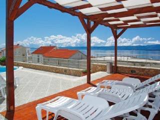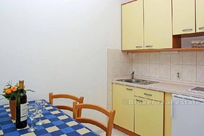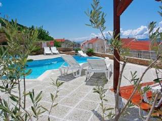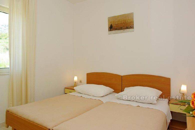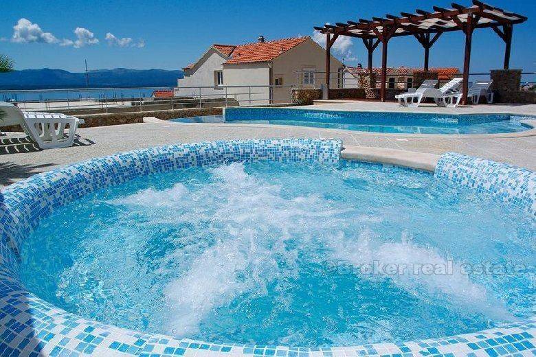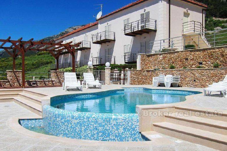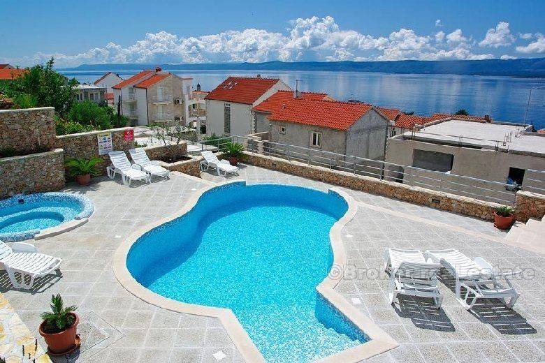 This exclusive property was built in 2002. as an apartment house, with a total living area of 870 m2, located on a plot of 900 m2. It is located in one of the most popular areas of the island of Brac, near the beautiful and visited beach. It consists of 20 fully furnished suites, spread over three floors. Each apartment consists of a bedroom, a bathroom, a kitchen, a living room and a terrace with a beautiful, open sea view. All apartments are air-conditioned. There is also a laundry room (100 m2). In front of the existing building there are two building land plots, each of 460 m2, which are also included in the mentioned price. One parcel is currently used as a parking lot, while the second one has a swimming pool with a sunbathing terrace.  The facility is currently in the function of tourism and achieves excellent results.