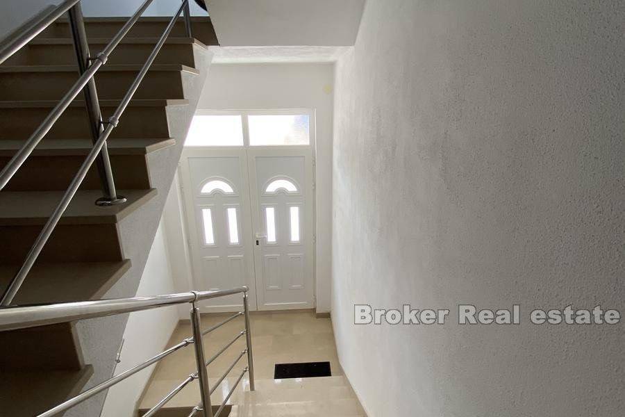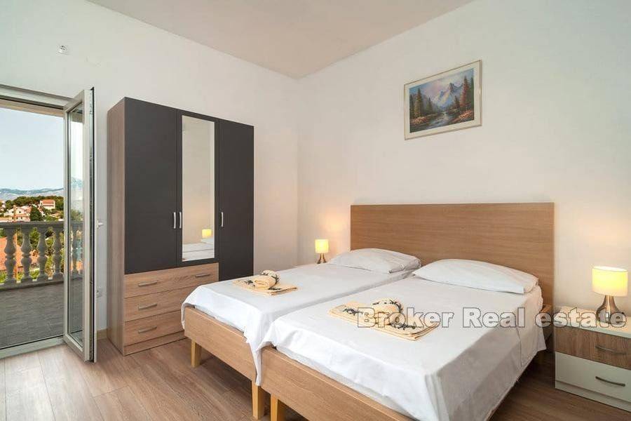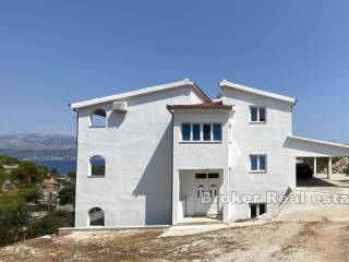 Spacious detached house located on a plot of 477m2, with a beautiful view of the sea and the town center from all floors. It consists of three residential floors (ground floor, first floor, second attic floor) with a total living area of 399.80 m2 gross. The ground floor is in rou bau design, and consists of two apartments, one large covered terrace, a smaller covered terrace, a small storage room and a large basement. On the first floor there are three furnished apartments. The first larger apartment consists of a living room with kitchen, bathroom, bedroom and exit to a large terrace. The other two smaller apartments are connected by an entrance hall and consist of a room with a kitchen and a bathroom, and each has access to its own terrace. The high attic is also divided into three apartments with the same layout as the first floor and two terraces. Each apartment on this floor has an air conditioning system. The house is surrounded by a yard that leaves the possibility of arranging a garden, installing a swimming pool and 6 parking spaces, and on the side of the house there is a covered garage with two parking spaces. The town center, as well as all necessary facilities (cafes, restaurants, shops), are located 160m away. The nearby natural stone beaches are only 500 meters away.