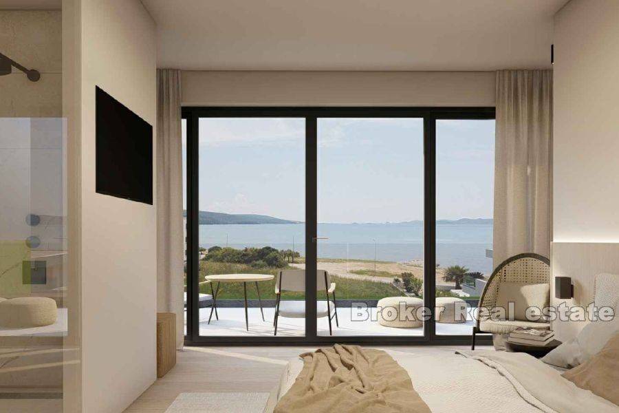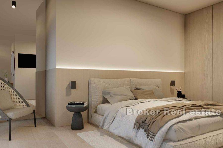 A brand new project in Sukošan is for sale. It is a detached villa on three floors, with a total living area of 352 m² and a land area of 497 m². On the ground floor there is an entrance, a hallway, a kitchen with a dining room and a spacious living room, a guest toilet, a storage room and a partially covered terrace. On the first floor there is a hallway, a bedroom with a wardrobe and a bathroom, a bedroom with a partially covered terrace and a bathroom, and a bedroom with an uncovered terrace and its own bathroom. The second floor consists of one bedroom with a bathroom and a covered terrace, a fitness or wellness room and a partially covered terrace. In the courtyard of the villa there is a heated swimming pool with a total area of 42m², a terrace and a space for socializing. Parking is provided for two vehicles and there is also a charging station for an electric car. The planned start of construction is January 2024.
