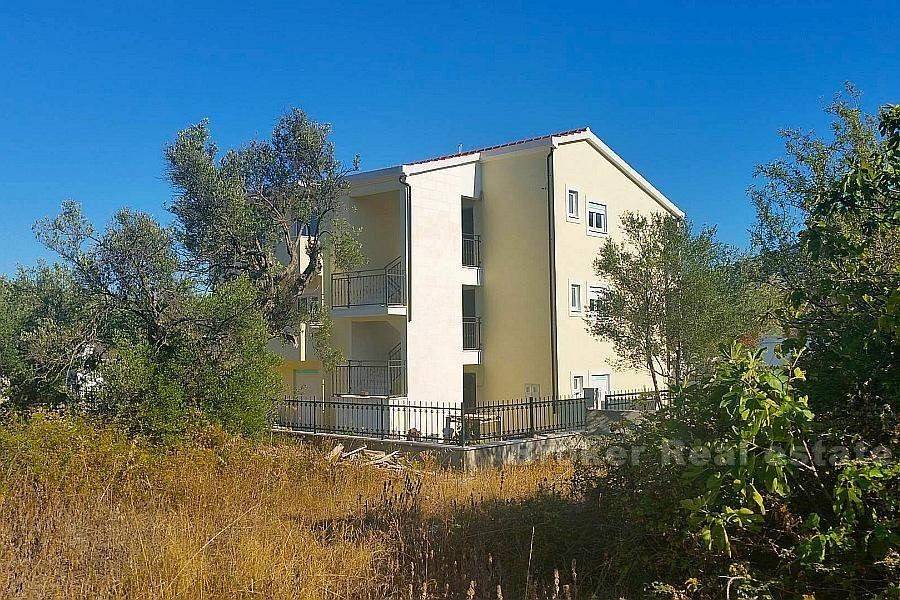For sale is a new house, 100m from the beach with a total of 7 apartments (45m2) and one apartment 95m2 in a quiet bay tourist village near Trogir. The house has a total area of 450m2 with an open staircase and balconies. Each apartment has a balcony and a separate entrance. Land is 550m2 with a garden, a swimming pool and Jacuzzi. The bay is suitable for anchoring the ship throughout the year, and laid out to sea and near the exit to the central Dalmatian islands. It is a peaceful place, ideal for those looking for relaxation or adventure tourists who enjoy research, hiking, biking. One hundred meters from the house is a steep climb up the hill to the top of which offers a view of more than 30 islands of the Dalmatian archipelago. The property is only 30 minutes from Split (the second largest city in Croatia and the cultural and historical center of the region. Diocletian’s palace under the protection of UNESCO). In the vicinity of the Krka National Park, as well as the centuries, the historic towns of Sibenik and Trogir.