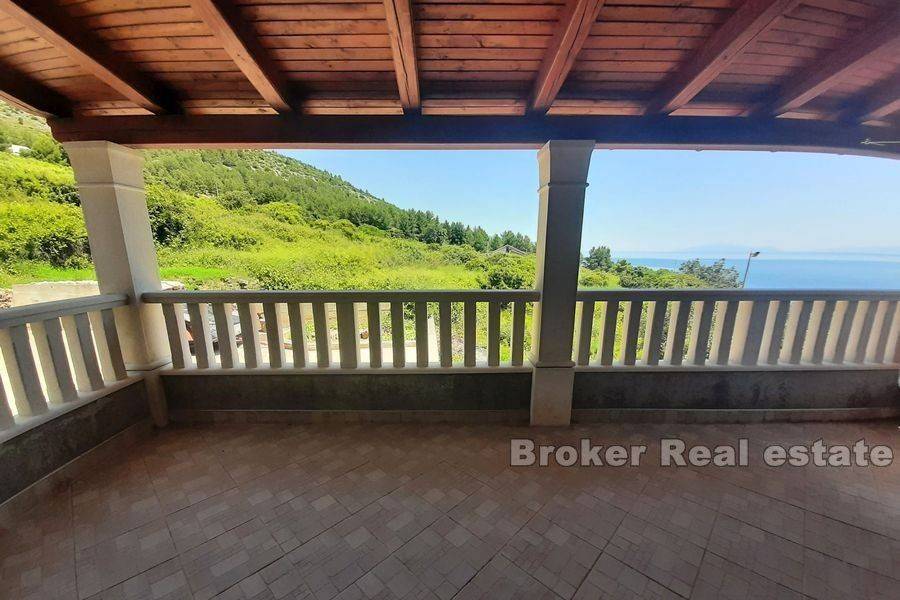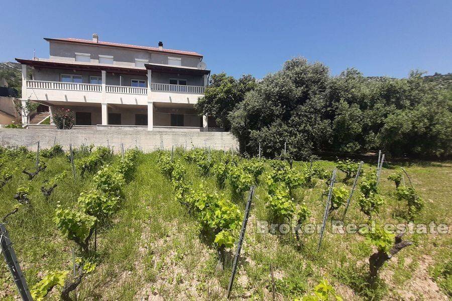 Detached, partially unfinished house for sale, located on a plot of 822 m2, total living area of 600 m2, in the first row by the sea in a picturesque place on the island of Hvar. The house is characterized by a well-organized space, and consists of: – ground floor; a three-room apartment (each room with an attached bathroom and a large terrace) in the east, a two-room apartment in the west (with one bathroom and a spacious terrace), and an excellent and spacious tavern that is located on the north side and runs the length of the entire house. – 1st floor; a three-room apartment (with two bathrooms and two large terraces) in the east and a two-room apartment (with two terraces) in the west. – 2nd floor; three two-story apartments in unfinished condition (each with terrace with a beautiful view). Considering the housing options, access to the property and the very location near the sea and the town center, this offer reveals great potential and an ideal investment option on the island of Hvar. Three apartments in the house are currently used year-round, so the house is properly maintained and looked after. Behind the property there is a large parking lot for a dozen cars, as well as a garden and an olive grove on the side of the house. An excellent and rare opportunity for a buyer, in an ideal position with numerous possibilities.