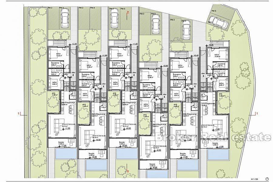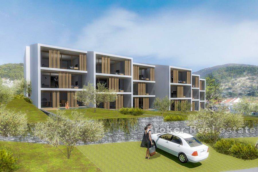 Two bedroom apartment with a total living area of 91 m2 located on the south side of the island of Brac, at a distance of 200 m from the sea. The apartment is situated on the first floor and extends along the entire floor. It consists of a living room, kitchen with dining area, two bedrooms, two bathrooms, additional toilet and storage room. The living room opens onto a loggia facing south, with a total area of 11.6 m2, providing a sea view. It has one parking space. The apartment is located in a residential building as part of a project of six residential units, each of which contains three apartments. The building itself consists of four floors – basement, ground floor and two floors. The basement serves as a storage space and equipment for the purpose of maintaining the building. On the other floors there are apartments. The apartments have a similar concept and interior design. There are 17 more apartments available for sale: Two bedroom apartments on the ground floor with garden and pool: from 338,580 EUR to 356,400 EUR Two bedroom apartments on the first floor with parking space: from 270 900 EUR to 273 900 EUR Two bedroom apartments on the second floor with parking space: 333 125 EUR