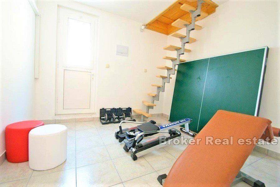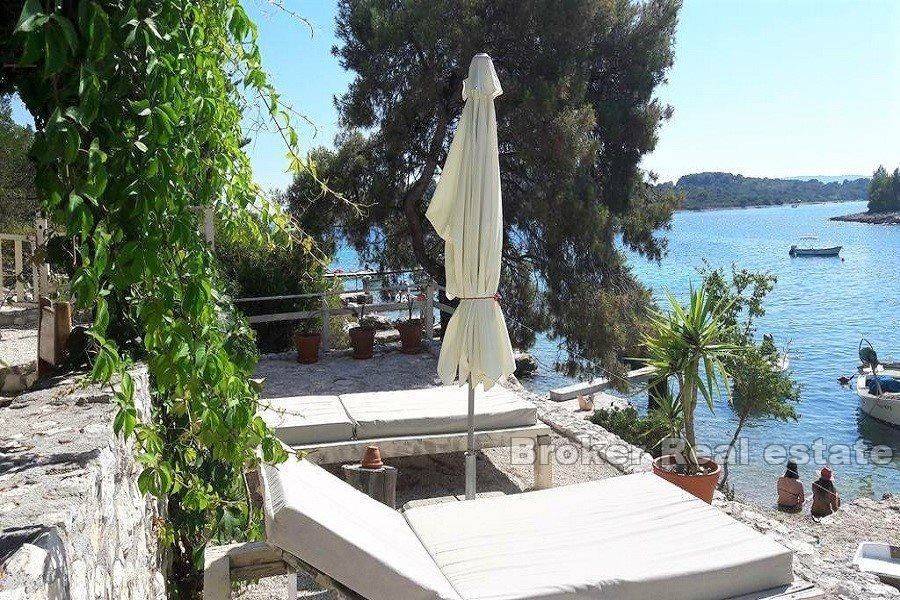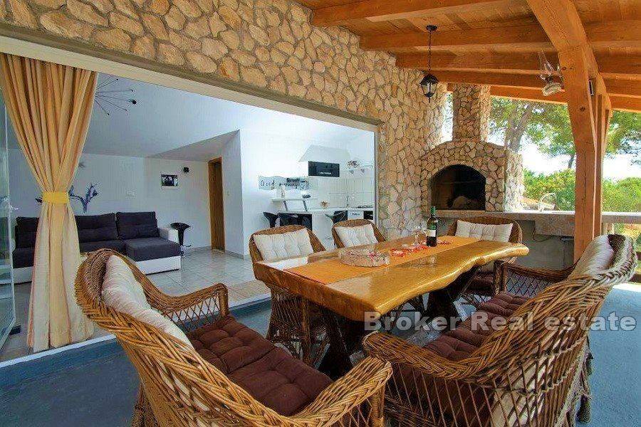 House first row to the sea located on the south side of the Čiovo peninsula. The house is spread over two floors. -On the ground floor there are 4 rooms with bathroom, this ground floor has direct communication with the garden or with a large number of sunbathing areas that are cascaded across it. -On the first floor which can be reached by a smaller internal and larger external staircase there is a bathroom, living room with kitchen and dining room with access to a large terrace where there is a stone barbecue and a large family table a place for family gatherings. The garden is cultivated and harmoniously decorated with plenty of places to enjoy, sunbathe and socialize. The property is ideal for lovers of peace and privacy, or Robinson tourism. The town center is 1 km away, while the international airport is only a twenty-minute drive away.