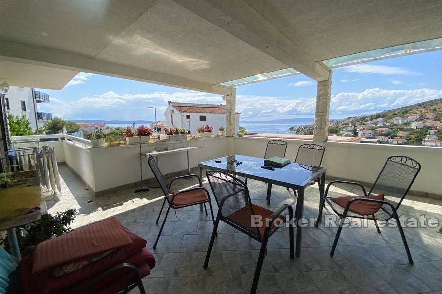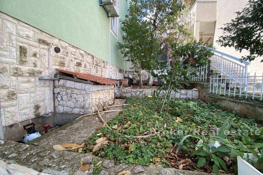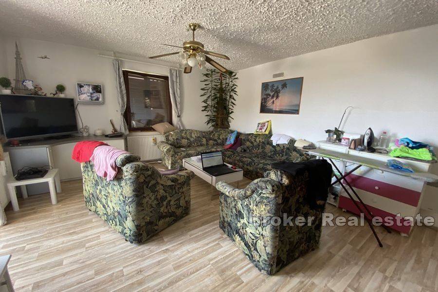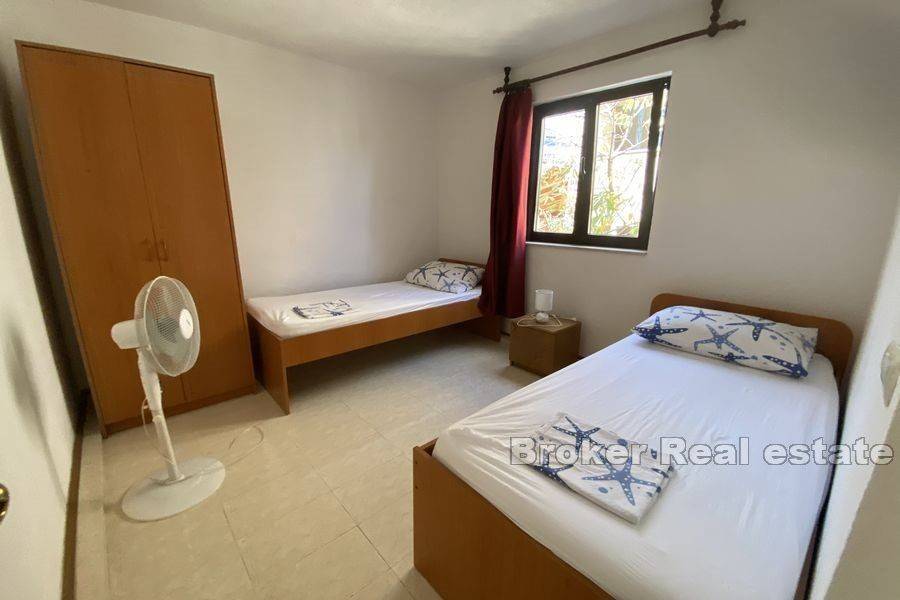 House with a total living area of approximately 370m2 gross, located on land with a total area of 442m2. It is located in one of the most beautiful bays on the island of Ciovo, at a distance of 170m from the sea. This spacious house consists of three floors and a basement, and leaves room for tourist and private ambitions. The basement floor consists of 7 parking spaces and a garage with one parking space and space for storage / laundry, auxiliary house with indoor fireplace and space for socializing, storage and basement. The whole ground floor is one apartment with hallway, two bedrooms, bathroom with toilet, large living room, dining room and kitchen, and has access to a large covered terrace overlooking the sea. On the other side there is a small apartment for disabled. The first floor is divided into two apartments with two bedrooms and one studio apartment. The high attic is divided into two apartments. All apartments are furnished and equipped, have built-in air conditioning and central heating, and each has access to a balcony with awning and sea view. In front of the house there is a landscaped yard with a swimming pool of approximately 20m2, access for the disabled, a summer kitchen equipped in the old Dalmatian way and a cascading garden. All necessary facilities (cafes, restaurants, shops) are located at a distance of 100-500m, beach 170m, bus station, marina and gas station are 5km away, and the airport 10km.