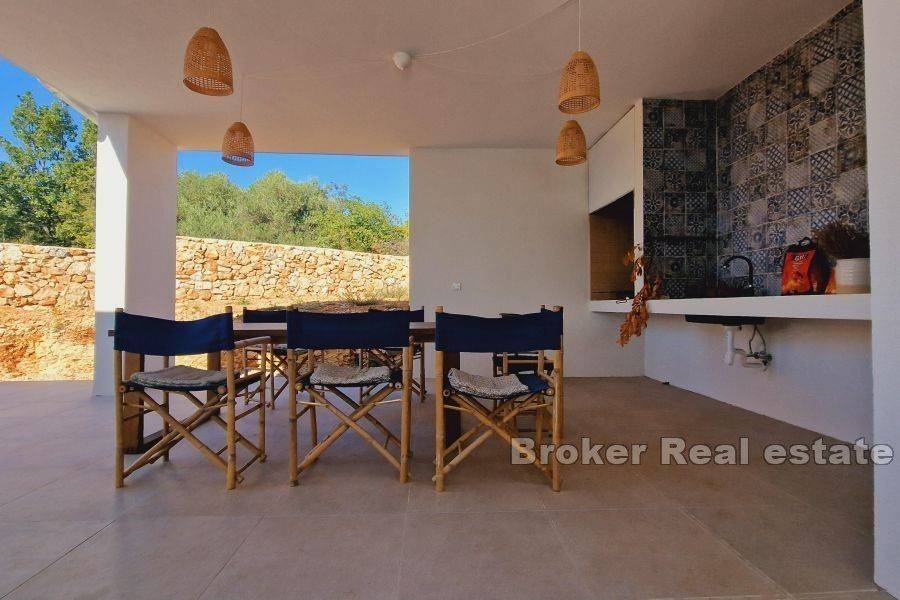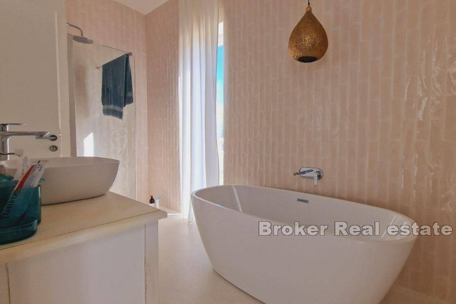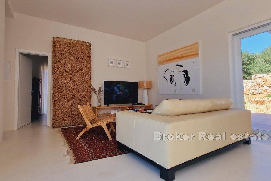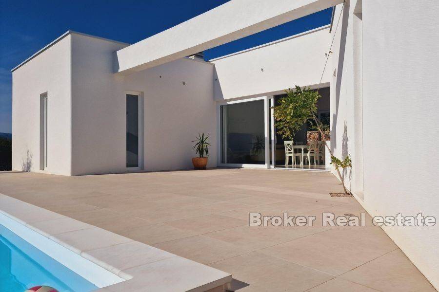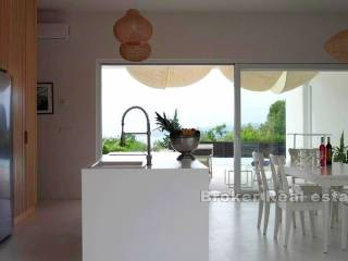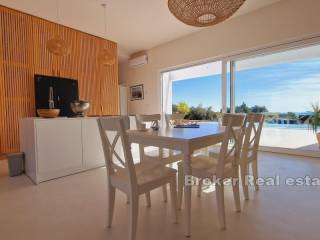 This modern villa is located near the town of Krk on the island of Krk. Thanks to its elevated position, it has an unobstructed panoramic view of the sea and islands. The total living area of 120 m2 consists of an entrance hall, three bedrooms, each of which has its own bathroom, storage room, toilet, kitchen with dining room and living room. There is a swimming pool in the spacious garden, which is functionally connected to the rest and dining area located under the covered veranda, which enables a year-round Mediterranean lifestyle in the open air. The quality-built villa is fully modernly furnished and equipped with quality equipment, it has PVC joinery, high-quality modern sanitary equipment and ceramics, an indoor fireplace, underfloor heating and is air-conditioned. It is located in a quiet rural location 2 km from the sea and beautiful beaches.