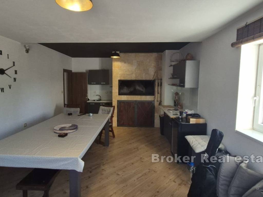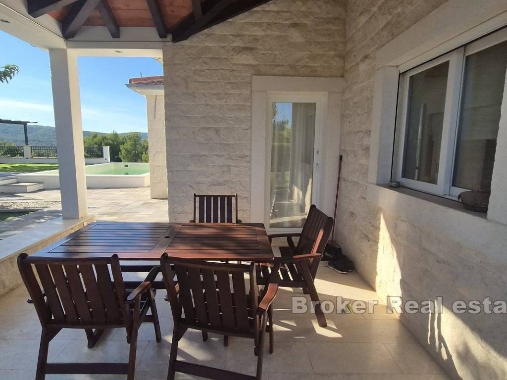 A villa is for sale, located in the surroundings of Šibenik, suitable for family living or as an investment for tourist rentals. The villa consists of three floors. The basement and boiler room are on the first floor. The second floor features two semi-covered terraces, a game room that includes darts, billiards, and a fireplace, a living room, dining room, kitchen, pantry, terrace, bathroom, WC, and a bedroom. On the third floor, there are two bedrooms, a bathroom, laundry room, hallway, and terrace. The exterior of the house includes a pool, outdoor fireplace, garage, and multiple parking spaces. The yard is spacious, and the rectangular part can be used for a sports field. The house is equipped with solar panels and has underfloor heating in the living room, kitchen, dining room, and bathroom on the ground floor. The villa is located 4.3 km from the sea and 4.5 km from the center of Šibenik, providing a peaceful atmosphere close to the city.