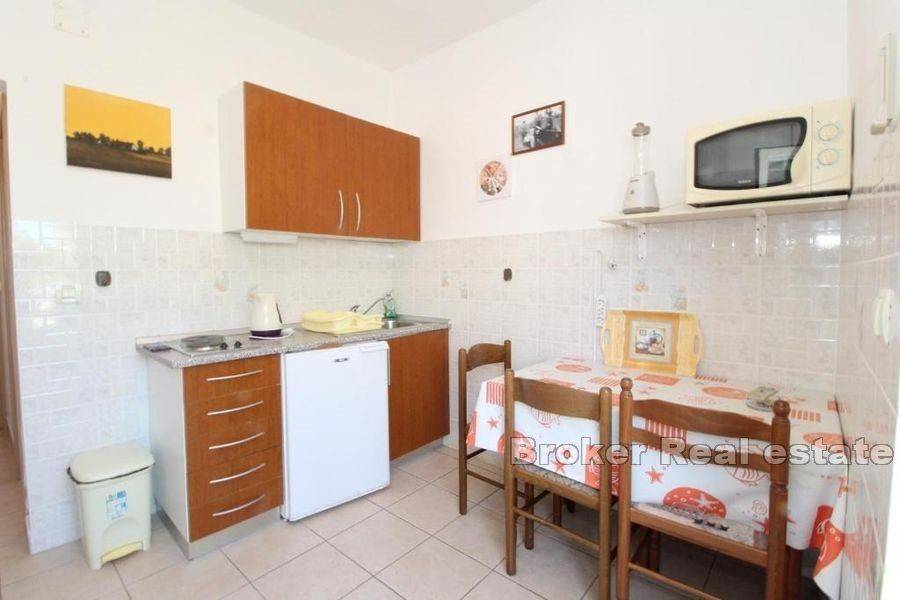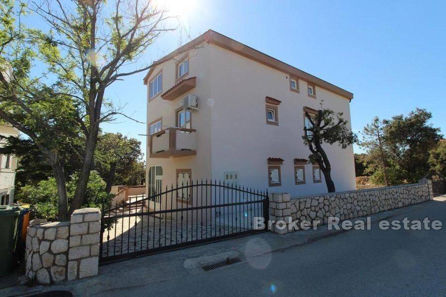 Apartment house with sea view located in a quiet location on the island of Pag, 300 m from the sea. The property with a living area of 460 m2 is located on a plot of land of 541 m2 and is spread over four floors. The basement floor consists of a basement and a laundry room. On the ground floor there are two apartments with adjoining terraces. They consist of two bedrooms, a kitchen with a dining room, a living room and a bathroom. There are three apartments on the first floor, two apartments have their own terrace, and the third has a balcony. One of the apartments consists of one bedroom, kitchen with dining room and one bathroom, the other two of two bedrooms, one bathroom and kitchen with dining room and living room. In the attic there is a studio apartment and three bedrooms with attached bathrooms. There is a possibility of buying an additional piece of land of 537 m2, and then the area would be 1078 m2 for a price of 1,500,000 Euros. The yard is enriched with an outdoor kitchen, a covered terrace with an outdoor dining area and children’s facilities. There is enough space inside the yard to build additional facilities such as a swimming pool. It is also possible to buy by floors. 1st floor – two two-bedroom apartments and one one-bedroom apartment at a price of 385,000 euros. 2nd floor – studio apartment, 3 bedrooms with bathroom, living room and kitchen with dining area at a price of 286,000 euros. The proximity of all the necessary facilities for living and being surrounded by real estate in the tourist business offers the possibility of continuing the already well-established tourist business.