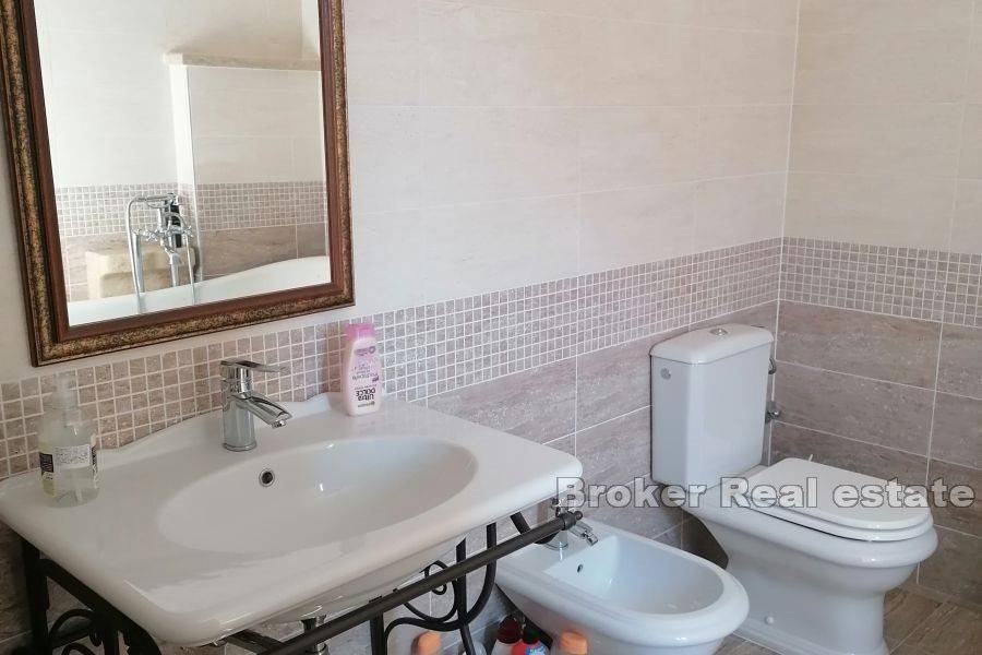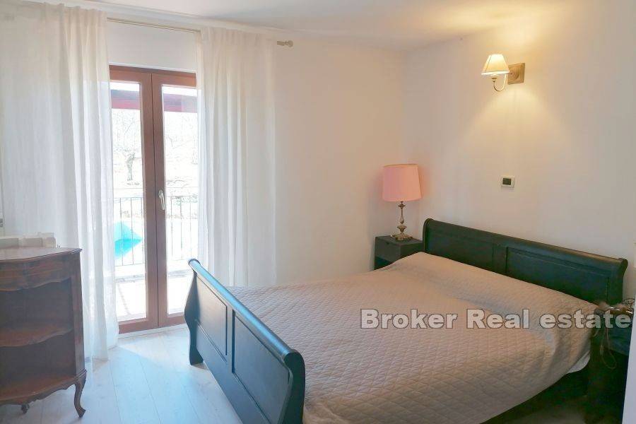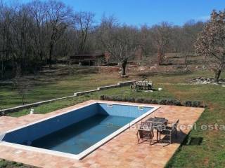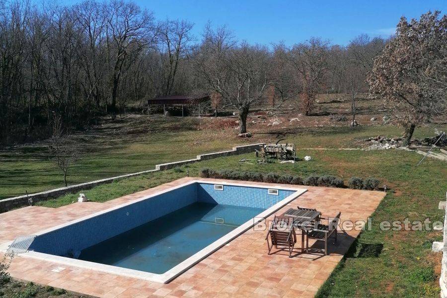 In a small village near Labin surrounded by forest, 7 km from the beautiful beaches in Rabac, there is an authentic stone house with a swimming pool, studio apartment, garage and storage space. It is an ideal investment for vacation or tourism, due to its good location, proximity to all necessary facilities, but also privacy. It is located in a small village with only a few houses that are oriented towards sustainable tourism. The house was renovated in 2018 and furnished in a traditional style that offers functionality as well as comfort. Natural materials such as stone and wood prevail, the details of which permeate the entire interior. The ground floor is a simple kitchen with a dining room and a living room where you can relax and enjoy the fireplace. A small storage room and a spacious bathroom round off the ground floor space. On the first floor, there are two spacious bedrooms, each with its own bathroom and a balcony overlooking the pool and a spacious garden surrounded by woods. In the high attic there is another bedroom with a bathroom and a terrace. Next to the house is a studio apartment of 33 m2. Garage with automatic door where you can place a car, and outdoor parking space for 3 more cars. The house is surrounded by a garden with an orchard that occupies 4462 m2. The yard is flat, landscaped and completely fenced.
