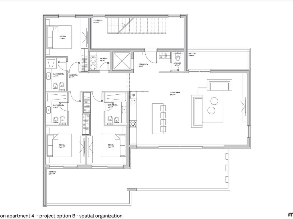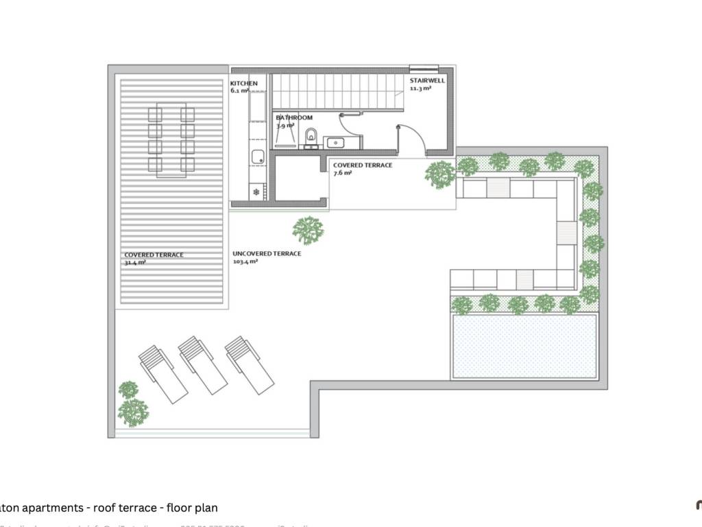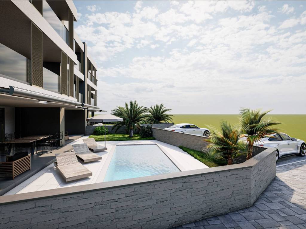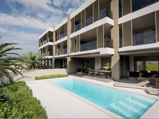 Penthouse površine 256,04 m2 sastoji se od kuhinje, blagovaone, dnevnog boravka, wc-a, praone, tri spavaće sobe, tri kupaonice ( svaka soba ima vlastitu kupaonicu), ostave, tri natkrivene terase i krovne terase. Na krovnoj terasi se nalaze još jedna kuhinja, wc i vanjski bazen. Stanu pripadaju dva vanjska parkirna mjesta. Doslovno iz cijelog stana se pruža prekrasan pogled na more. Tlocrtna površina stana je 403,04 m2. Nalazi se u manjoj stambenoj zgradi koja se sastoji od 8 stambenih jedinica.