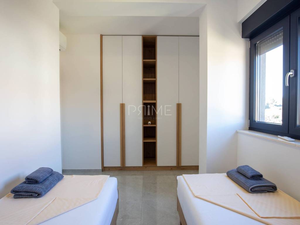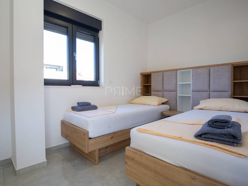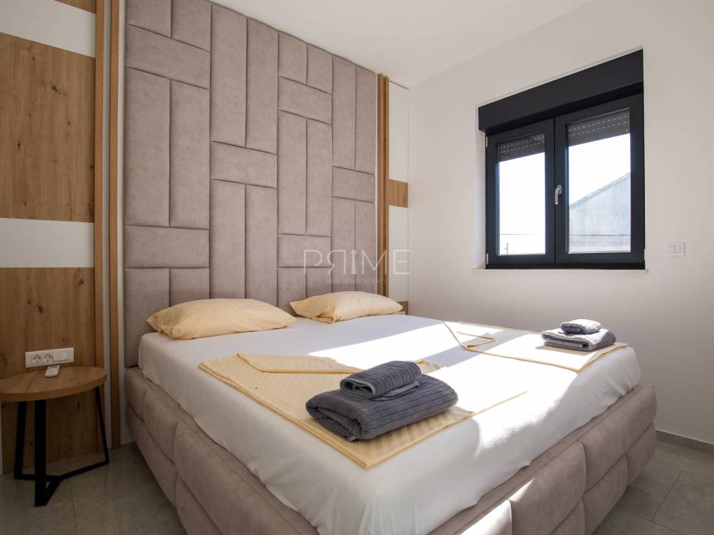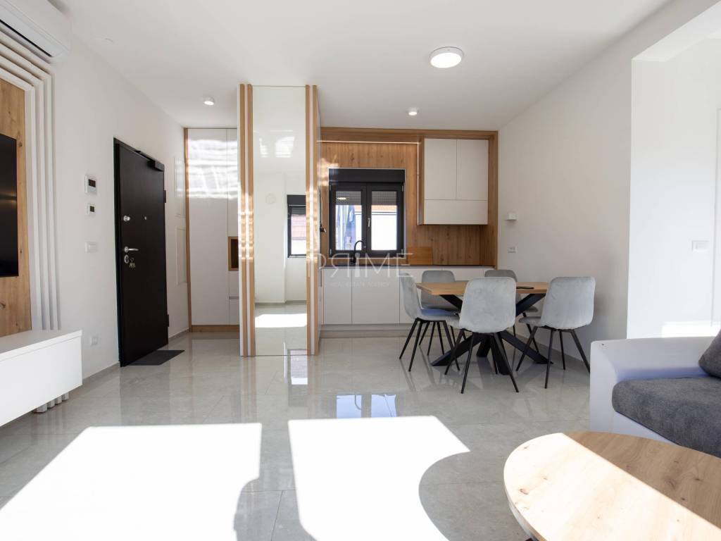 Stan površine 70,37 m2 ( tlocrtna površina stana s pripadcima 96,46 m2) sastoji se od kuhinje, blagovaone, dnevnog boravka, kupaone, dvije spavaće sobe i lođe. Pripadci stanu su spremište u podrumu zgrade i dva vanjska parkirna mjesta. Stan je luksuzno namješten i opremljen te se takav i prodaje ( kao na slikama, svi uređaji su pod garancijama). U izgradnji i opremanju su se koristili isključivo najkvalitetniji materijali od renomiranih proizvođača. Prodavatelj je pravna osoba što znači da je kupac oslobođen plaćanja poreza na promet nekretnina. Više  informacija na upit!
