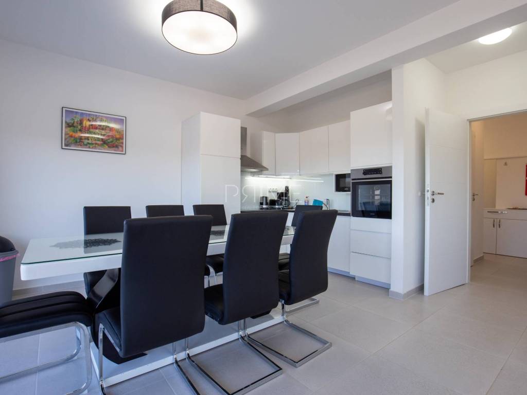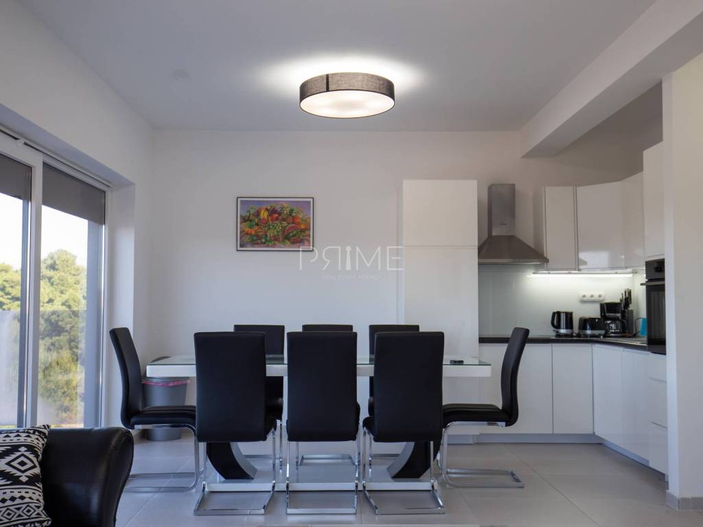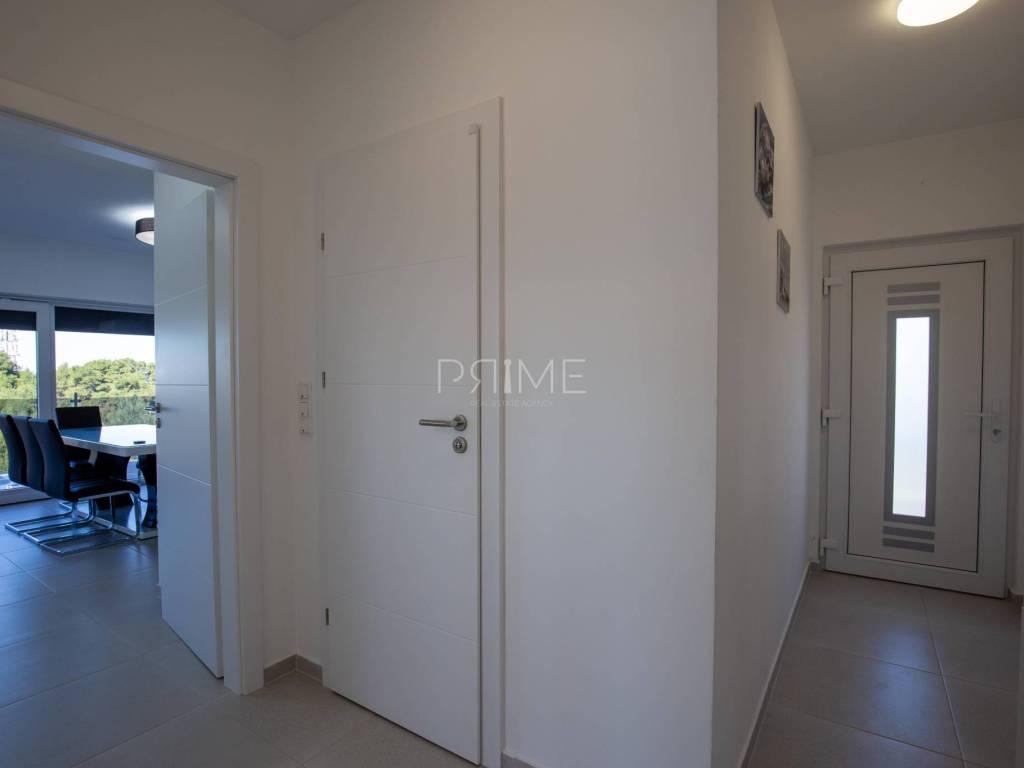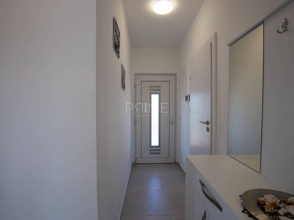 Stan površine 86 m2 sastoji se od kuhinje, blagovaone, dnevnog boravka, kupaone, tri  spavaće sobe, hodnika i natkrivene terase. Pripadci stanu su dva vanjska parkirna mjesta. Stan se prodaje kompletno namješten i opremljen kao na slikama. Nalazi se na mirnoj lokaciji u blizini centra mjesta, udaljenost od mora je nekih 500 metara. Zgrada se sastoji od 4 stambene jedinice. Više informacija na upit!