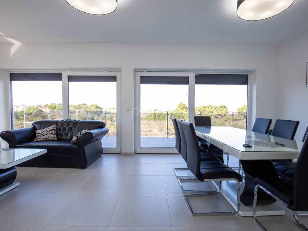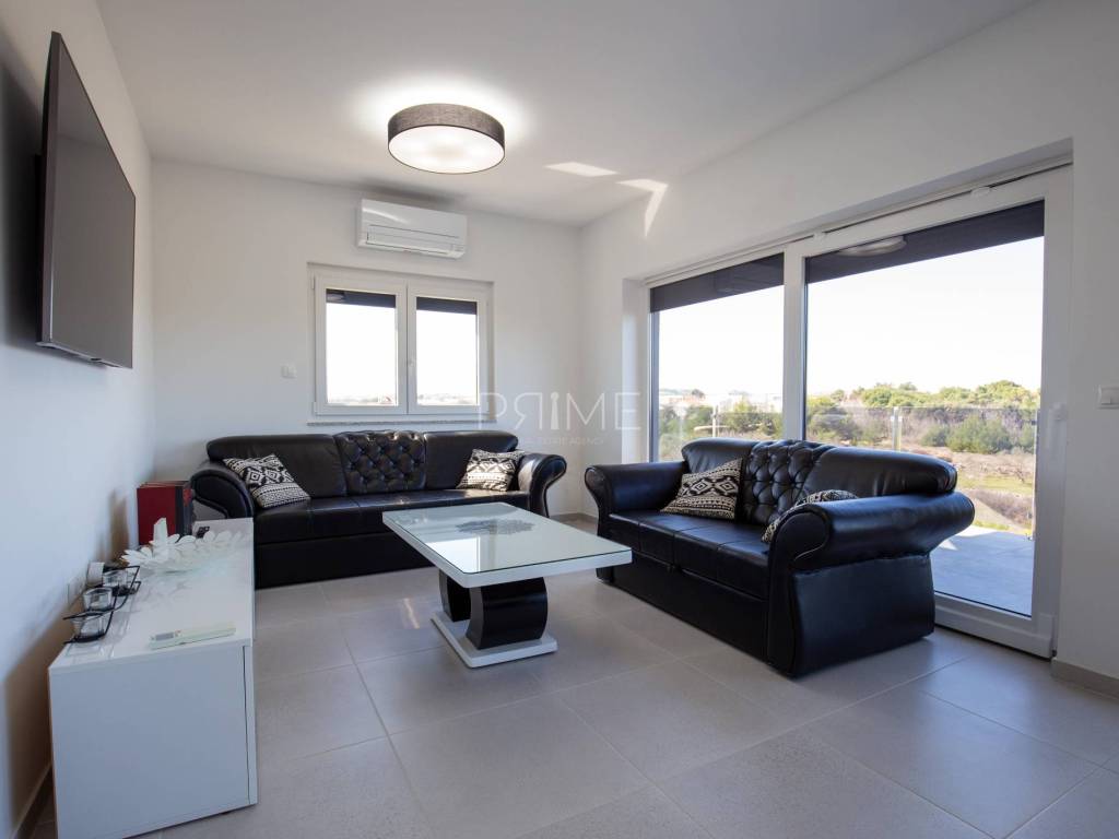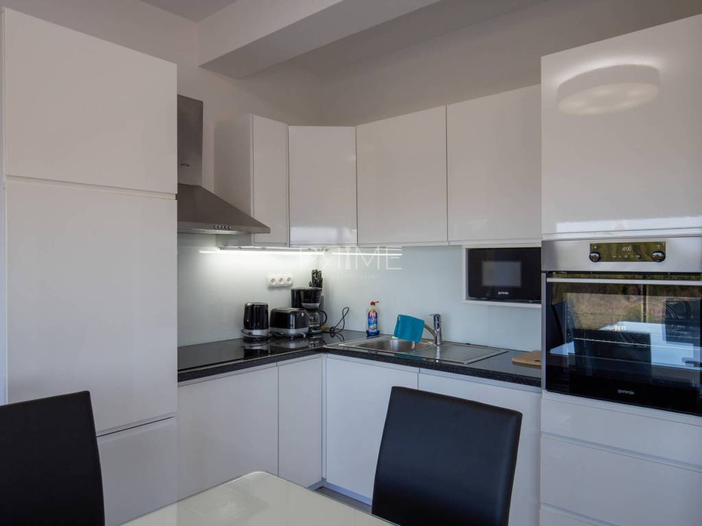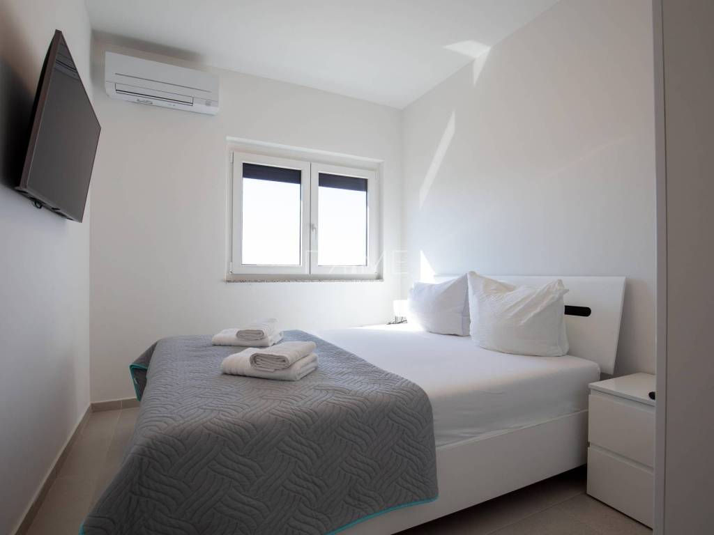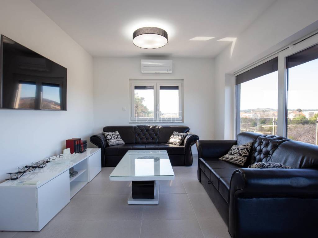 Stan površine 86 m2 sastoji se od kuhinje, blagovaone, dnevnog boravka, kupaone, tri  spavaće sobe, hodnika i natkrivene terase. Pripadci stanu su dva vanjska parkirna mjesta. Stan se prodaje kompletno namješten i opremljen kao na slikama. Nalazi se na mirnoj lokaciji u blizini centra mjesta, udaljenost od mora je nekih 500 metara. Zgrada se sastoji od 4 stambene jedinice. Više informacija na upit!