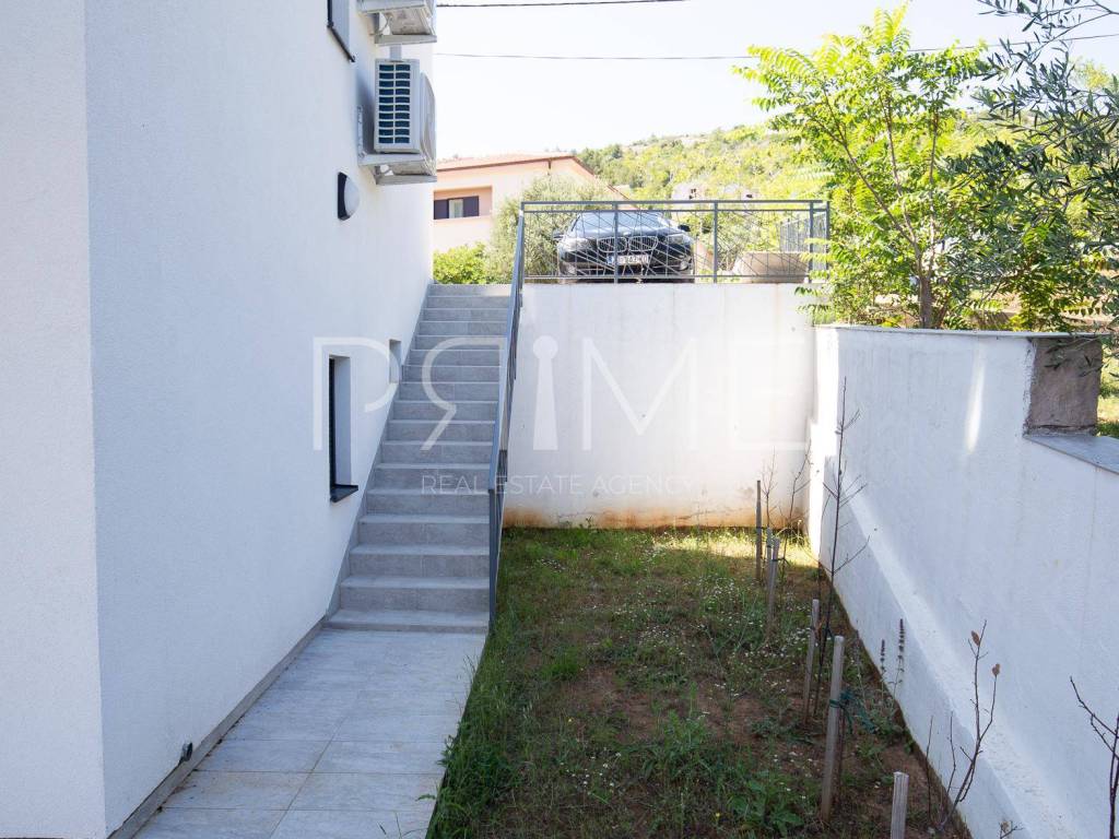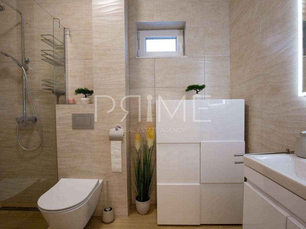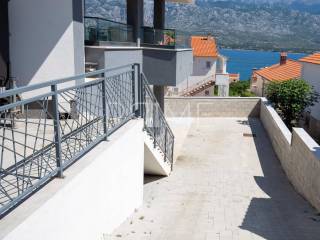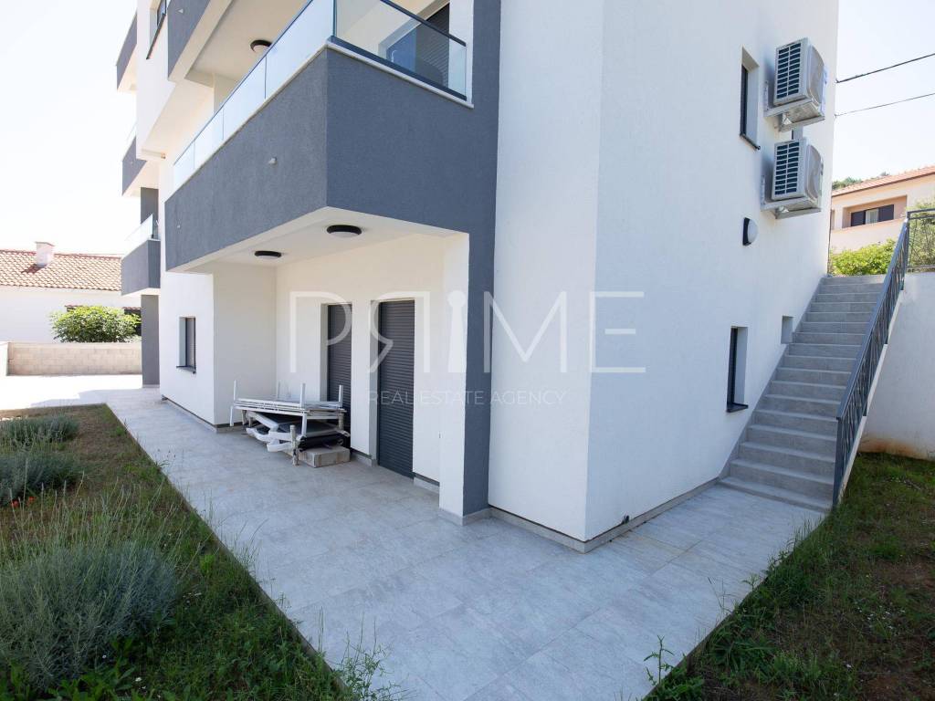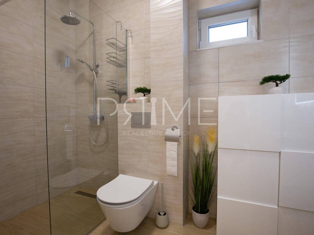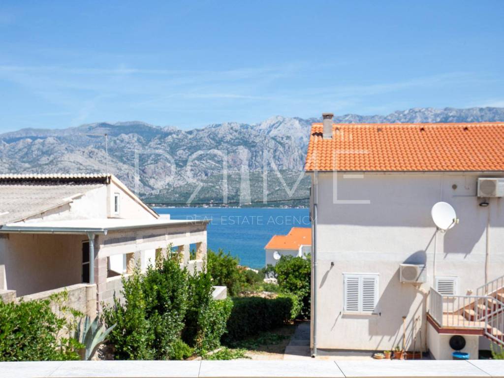 Stan površine 116 m2 sastoji se od od kuhinje, blagovaone, dnevnog boravka, dvije spavaće sobe, kupaonice, wc-a i dvije natkrivene terase. Pripadci stana su vrt i parking. Nalazi se na odličnoj lokaciji udaljenoj od mora i plaže 150 metara. Prodaje se kompletno namješten i opremljen. U izgradnji su korišteni pototherm block, 10 cm sitropor fasada, povc stolarija, električne rolete, komarnici, svaka prostorija je klimatizirana.... energetski certifikat A. S terase se pruža pogled na more i Velebit. Više informacija na upit!