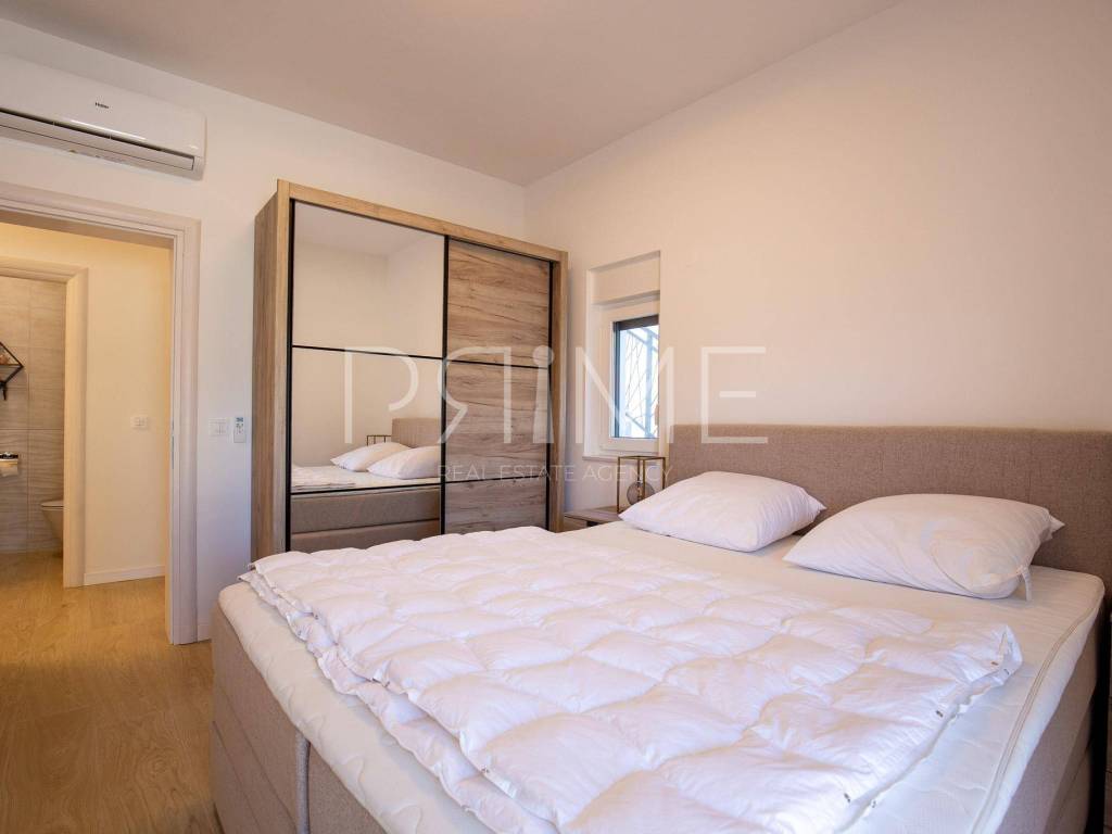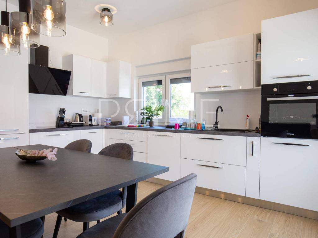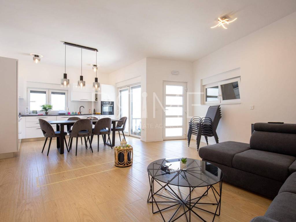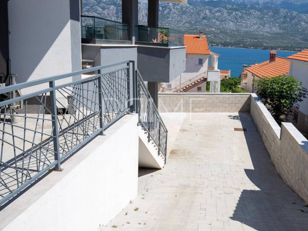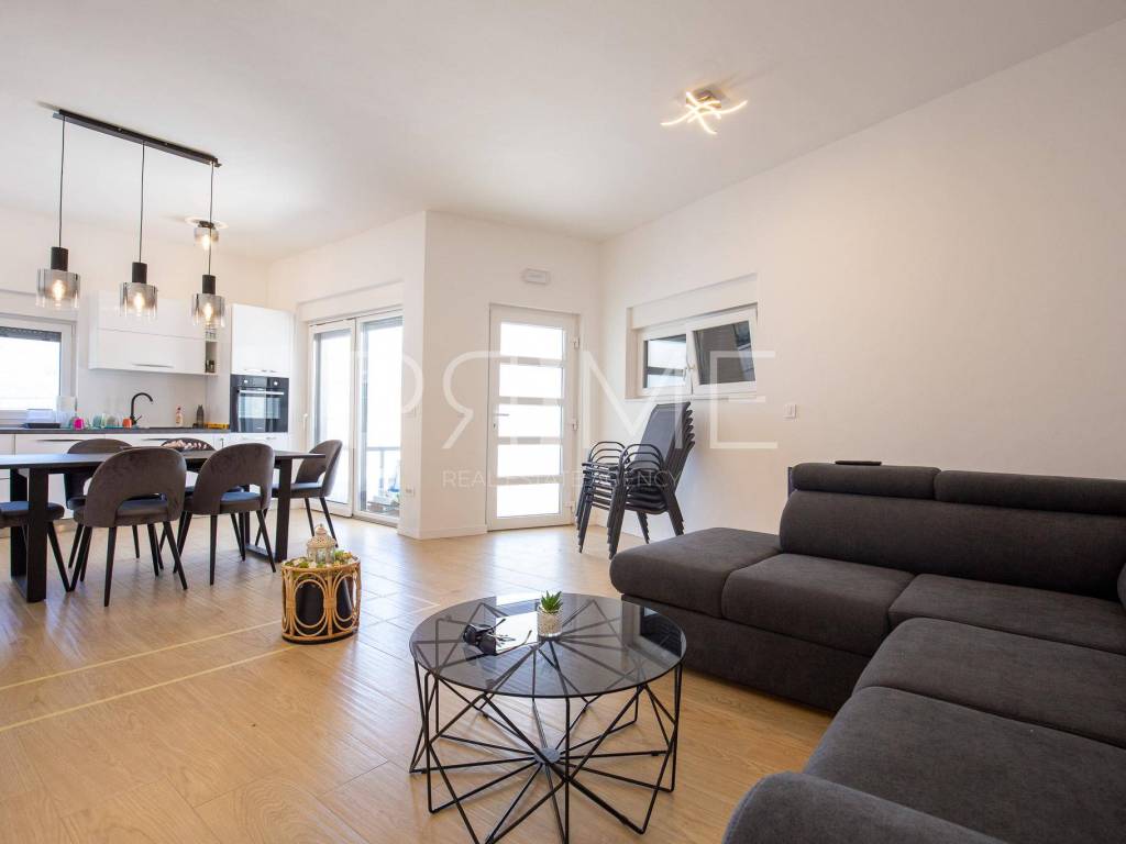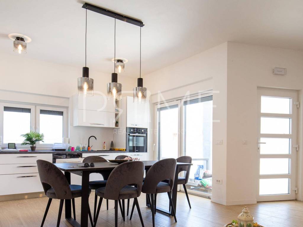 Stan površine 116 m2 sastoji se od od kuhinje, blagovaone, dnevnog boravka, dvije spavaće sobe, kupaonice, wc-a i dvije natkrivene terase. Pripadci stana su vrt i parking. Nalazi se na odličnoj lokaciji udaljenoj od mora i plaže 150 metara. Prodaje se kompletno namješten i opremljen. U izgradnji su korišteni pototherm block, 10 cm sitropor fasada, povc stolarija, električne rolete, komarnici, svaka prostorija je klimatizirana.... energetski certifikat A. S terase se pruža pogled na more i Velebit. Više informacija na upit!