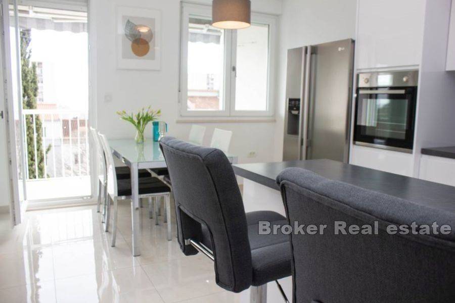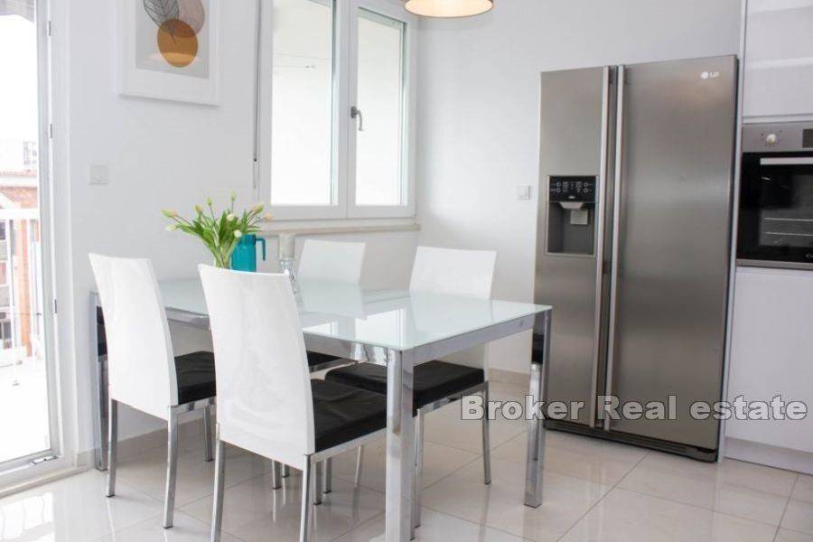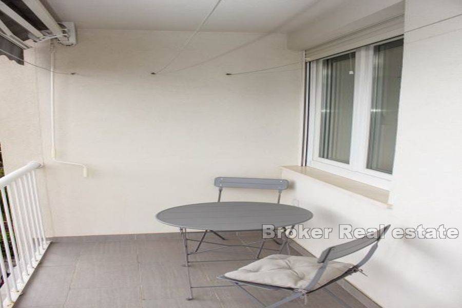 Long-term rent of a fully equipped two-room apartment of 73m2 in Lokva. It is located on the 4th floor with a southeast orientation, which provides plenty of natural light throughout the day. The apartment consists of two spacious bedrooms, a comfortable living room, and a fully equipped kitchen with modern appliances, including a dishwasher and a large refrigerator. The bathroom is equipped with underfloor heating for extra comfort. A particularly attractive part of the apartment is the spacious southern loggia with a view of the sea, ideal for relaxing and enjoying nature. Its convenient location allows quick access to the beach within 10 minutes, as well as to the campus, which is only a 5-minute walk away. The city center is 15 minutes away on foot, providing convenience and ease of access to all city facilities.