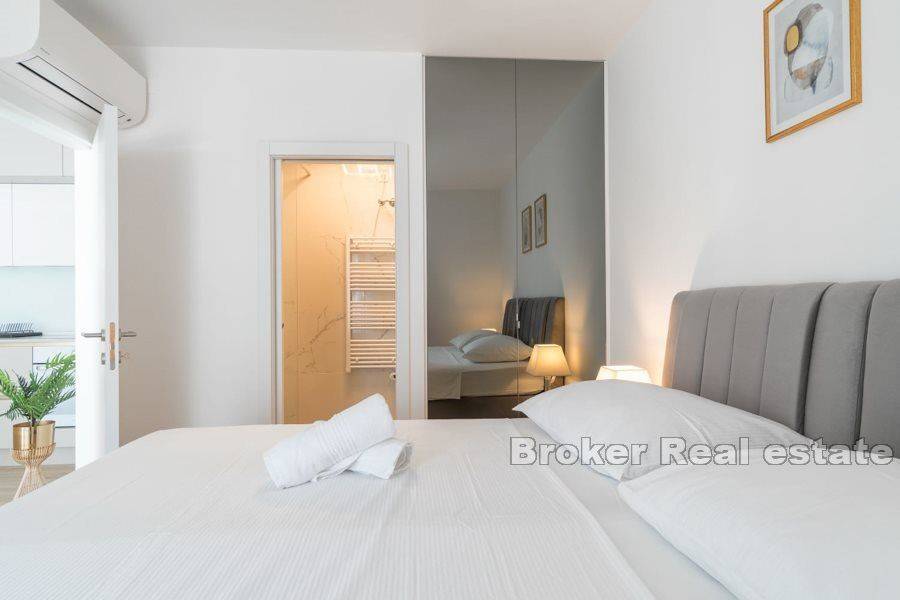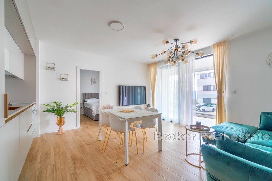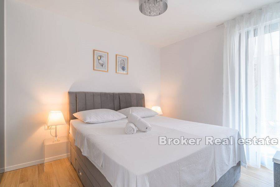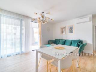 Modern and luxuriously furnished apartment in the area of Znjan, located on the ground floor of a brand new residential building completed several months ago. It is south facing and has a partial sea view. It has a living area of 67 m2, with two bedrooms, one of which has its own bathroom, living room with kitchen and dining area and access to a large enclosed terrace and an additional bathroom. It is equipped with all necessary devices and the highest quality furniture. The apartment also has a garage space in a large garage which can be reached by elevator and stairs and another outdoor space. It is only 5 minutes away from the beach and promenade. * Considering the volatility and dynamics of renting, the ad is informative and does not necessarily mean that this apartment is available for rent. For current information, please contact us.