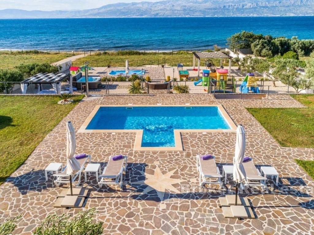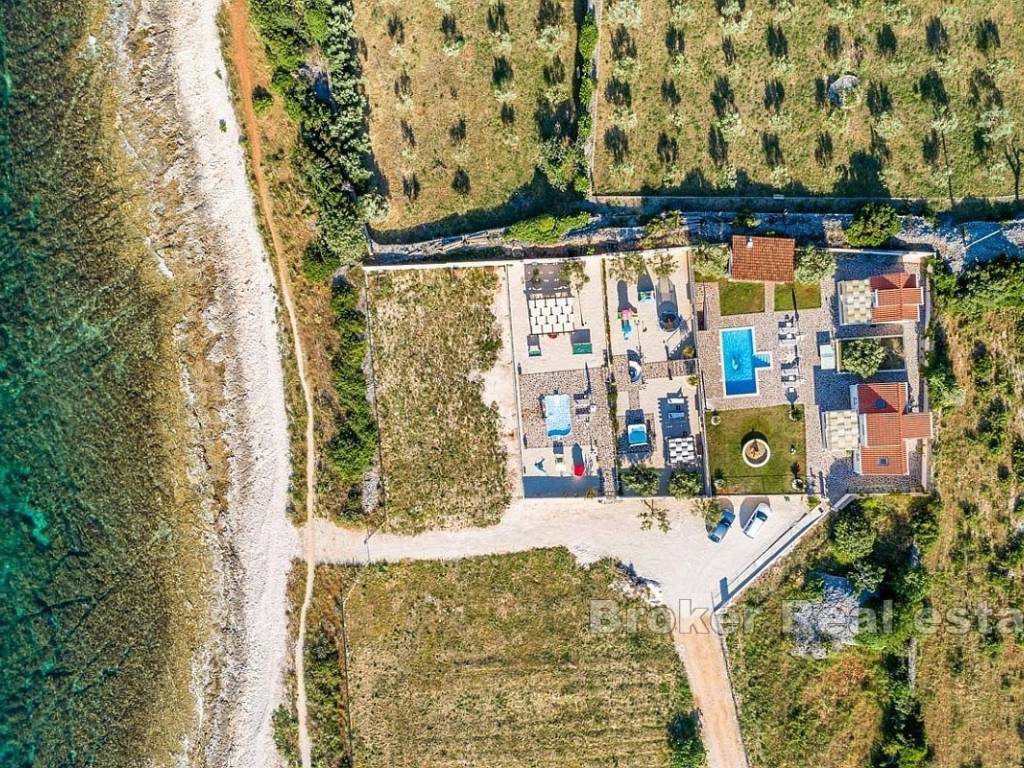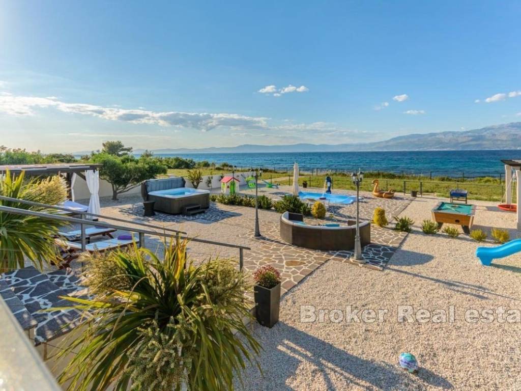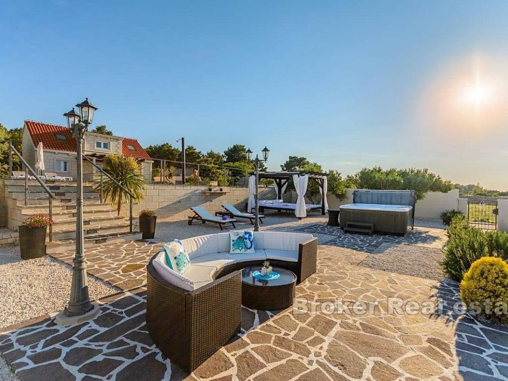 Located in the picturesque setting of the island of Brač, this charming stone villa offers an ideal retreat for lovers of luxury and nature. The villa is situated right by the sea, offering direct access to the beach, and is surrounded by a spacious, fenced property that guarantees privacy and tranquility. Perfectly integrated into the Mediterranean landscape, the villa consists of two houses – a large one and a small one – providing comfortable accommodation for up to 10 guests. The main house features two spacious bedrooms, two elegant bathrooms, a fully equipped kitchen, a dining area, and an airy living room with a sea view. The smaller house offers a more intimate space with one bedroom, a bathroom, and its own kitchen and dining area, ideal for family or friends. Both houses are equipped with air conditioning to ensure optimal temperatures throughout the year. The outdoor area of the villa is particularly impressive – a heated pool, jacuzzi, and spacious sunbathing area invite you to relax under the warm sun. For those who enjoy outdoor gatherings, there is also a barbecue, perfect for preparing meals with the sound of the waves and the rustling of pine trees in the background. This luxury property offers everything needed for an unforgettable vacation – from a beautiful Mediterranean exterior, private parking, to numerous amenities for both adults and children. The rental price of the villa varies depending on the season, offering flexible options for all types of guests.