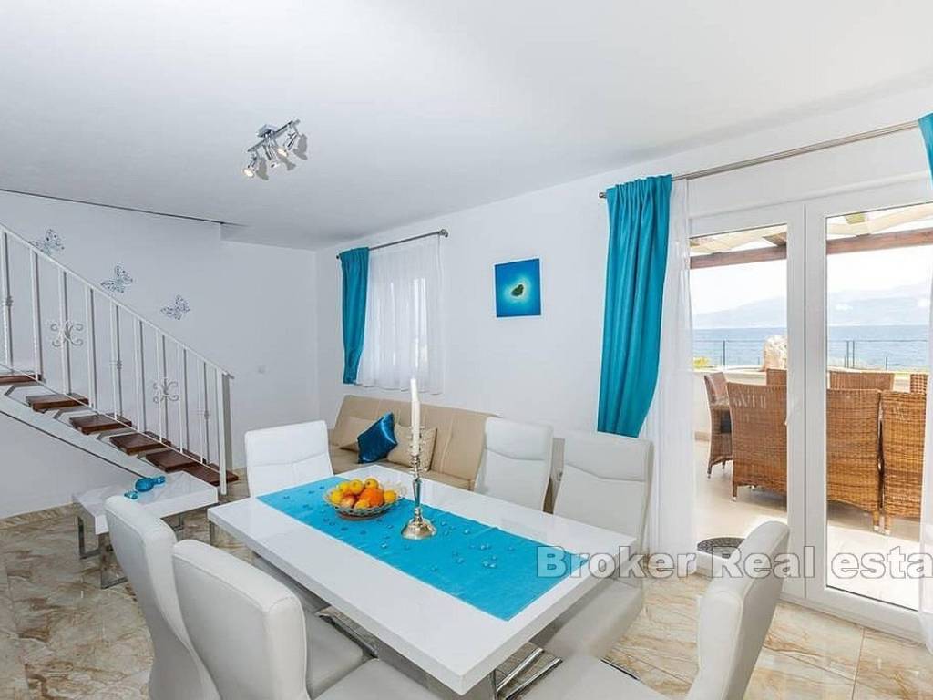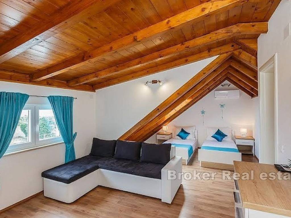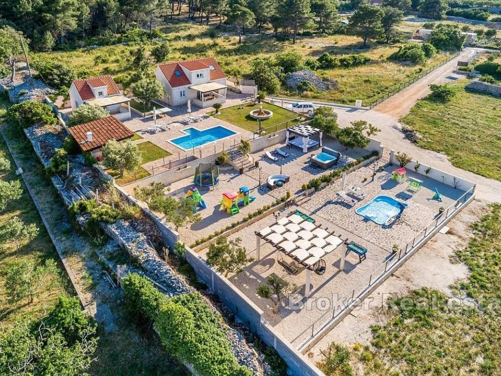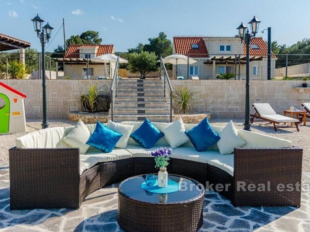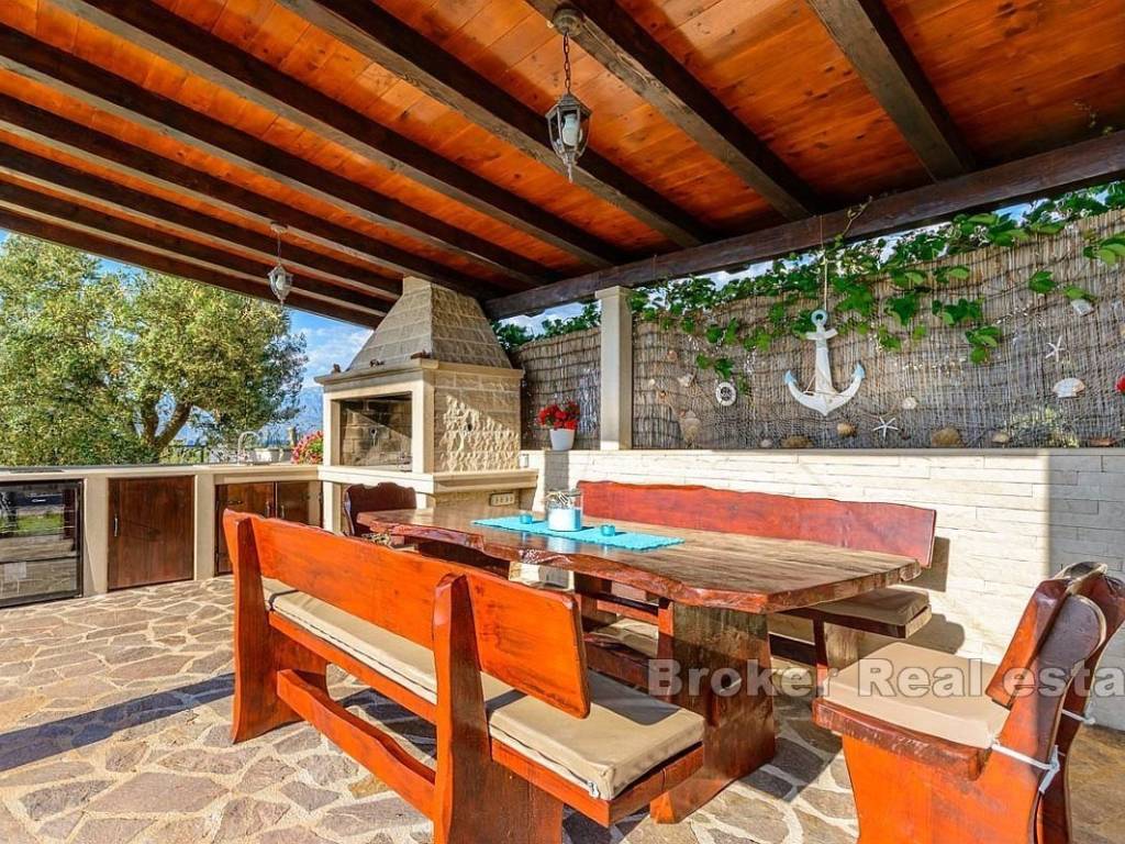 Located in the picturesque setting of the island of Brač, this charming stone villa offers an ideal retreat for lovers of luxury and nature. The villa is situated right by the sea, offering direct access to the beach, and is surrounded by a spacious, fenced property that guarantees privacy and tranquility. Perfectly integrated into the Mediterranean landscape, the villa consists of two houses – a large one and a small one – providing comfortable accommodation for up to 10 guests. The main house features two spacious bedrooms, two elegant bathrooms, a fully equipped kitchen, a dining area, and an airy living room with a sea view. The smaller house offers a more intimate space with one bedroom, a bathroom, and its own kitchen and dining area, ideal for family or friends. Both houses are equipped with air conditioning to ensure optimal temperatures throughout the year. The outdoor area of the villa is particularly impressive – a heated pool, jacuzzi, and spacious sunbathing area invite you to relax under the warm sun. For those who enjoy outdoor gatherings, there is also a barbecue, perfect for preparing meals with the sound of the waves and the rustling of pine trees in the background. This luxury property offers everything needed for an unforgettable vacation – from a beautiful Mediterranean exterior, private parking, to numerous amenities for both adults and children. The rental price of the villa varies depending on the season, offering flexible options for all types of guests.