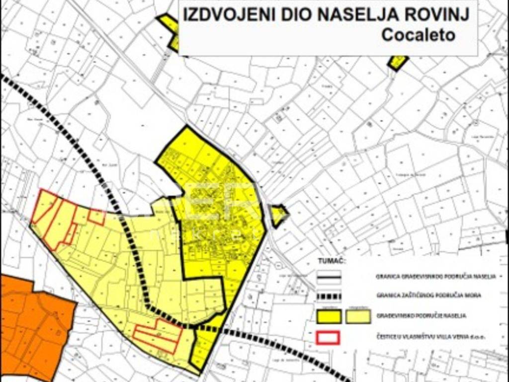 Prodaje se zemljište koje se sastoji od 6 čestica ukupne površine 24.788 m2 u naselju Cocaletto. Naselje je smješteno u okolici grada Rovinja, a samo zemljište je udaljeno 1.100 metara od mora. Prostornim planom uređenja naselje Cocaletto tretira se kao izdvojeno područje grada Rovinja na kojem će se detaljnijim planom odrediti visina gradnje i vrsta objekata s obzirom na broj stambenih jedinica, s mogućnošću da to bude zona s obiteljskim i višeobiteljskim objektima (maksimalno 4 stambene jedinice) maksimalne katnosti 3 nadzemne etaže. Minimalna veličina građevinske čestice za obiteljske građevine je 500 m2,