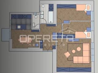 Sastoji se od ulaznog halla, dnevnog boravka u kojem roditelji spavaju jer je ugrađen bračni krevet u ormar, dvije spavaće sobe, gostinjskog toaleta, kupaone sa wc-om, kuhinja sa blagovaonom i izlazom na balkon. Uz stan dolaze dvije ostave. Jedna na tavanu veličine 10 tak m2 i u podrumu 15 tak m2.