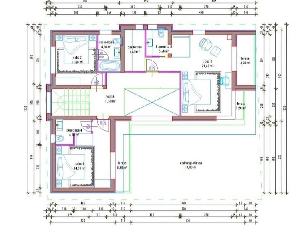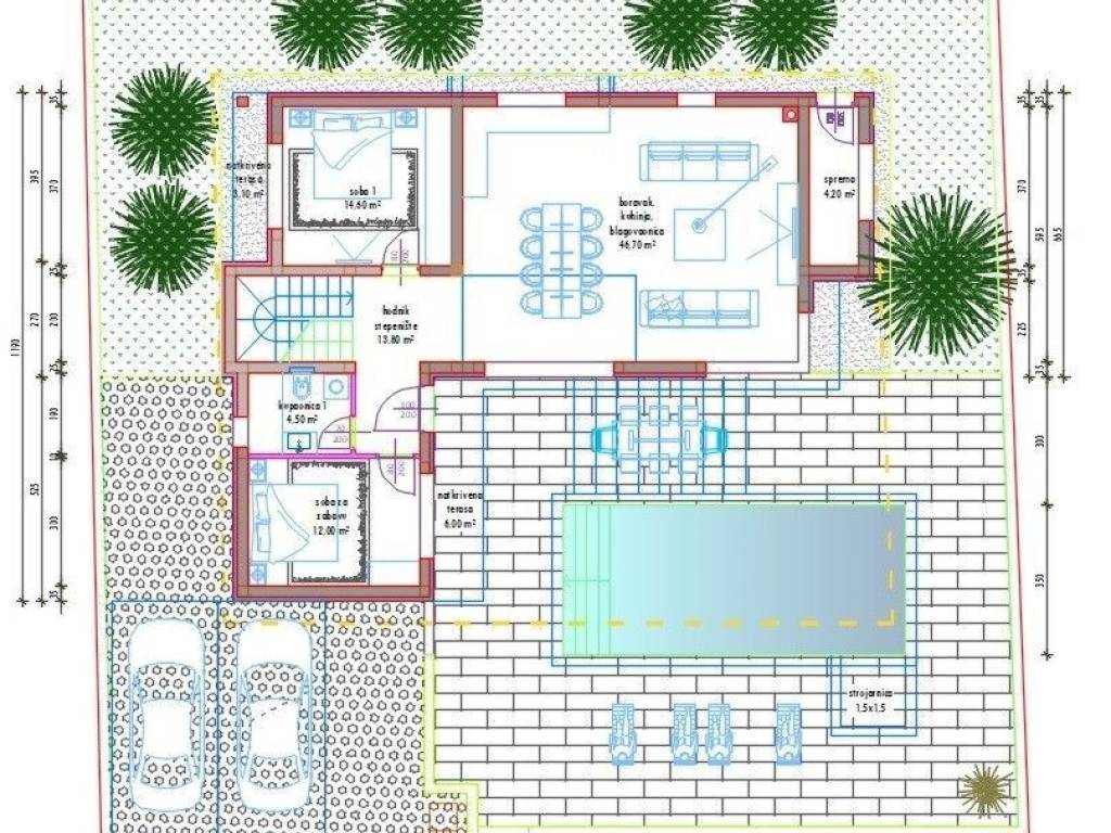 The pool located in the yard occupies 28 m2. Next to the pool, there will be an outdoor shower as well as a planned summer kitchen with a barbecue. Part of the yard serves as an uncovered parking space for three cars, and the rest is landscaped as a green area.