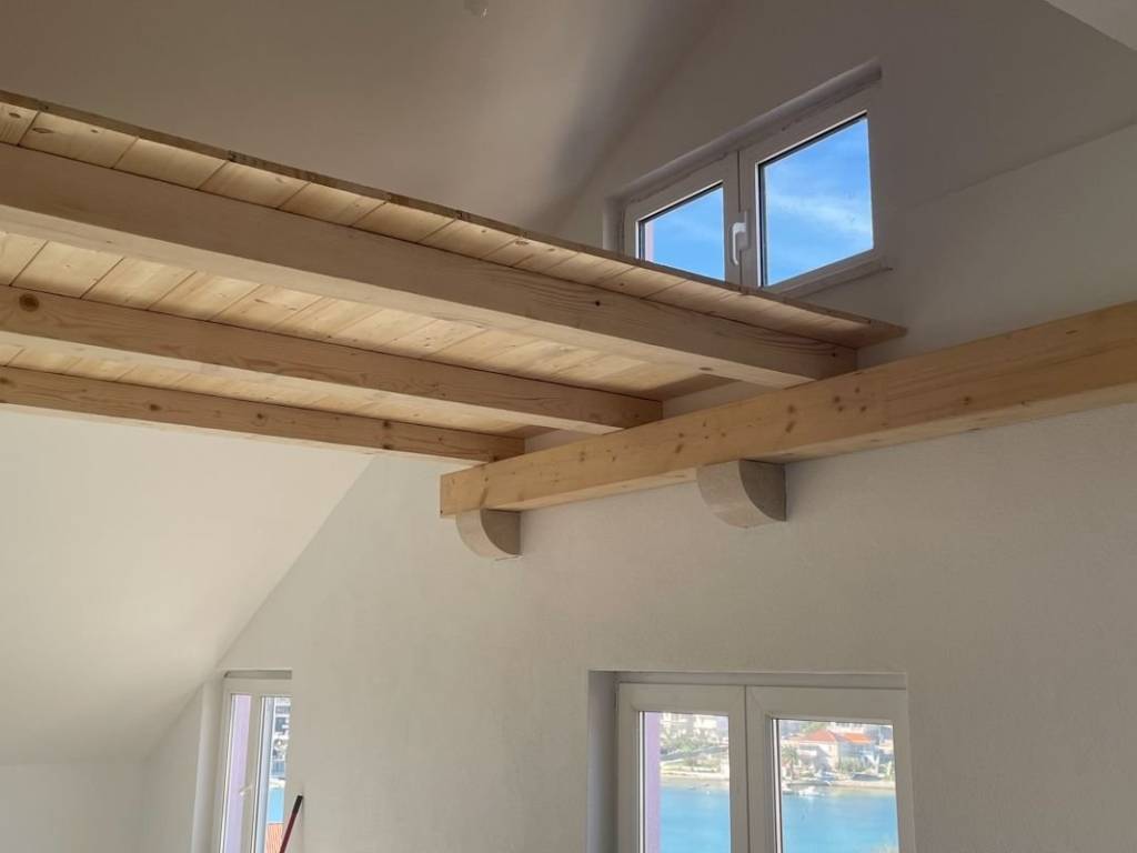 In an attractive location in a famous tourist spot on the island of Korčula, this beautiful property is located in the second row from the sea, only 80 meters from the crystal clear Adriatic Sea and an ideal place for swimming.   The house is a semi-detached building, oriented towards the sunny side and open to the sea, which allows an unobstructed view of the sea from both floors – almost from every window. The balcony, which offers a breathtaking panoramic view, is of particular value.   The property consists of two floors – the first floor and a high attic – which form two separate, functional apartments connected by an internal staircase. The entire house was completely decorated and equipped in 2024, from rough work to finishing and installations.   The total area of ​​the property is 127 m², of which 112 m² is living space and an additional approx. 10 m² of gallery space on the upper floor. In addition, the house has a garden and a yard of about 90 m², ideal for relaxing, socializing or enjoying a barbecue.   There is also a cultivable garden on the ground floor, while a private parking space is provided in front of the house.   The first floor consists of an entrance hall, a spacious living room, a kitchen with a dining room, a bedroom with a large bathroom, and a guest toilet.   The second floor, which is essentially a high attic, consists of a living room, a kitchen, a bedroom with a bathroom, a gallery space, and a storage room.   The property is equipped with air conditioning on each floor, while air conditioning has also been installed in all bedrooms.   This house is the perfect combination of modern comfort, an excellent location, and authentic Mediterranean charm – ideal for family life, vacation, or as an investment in a tourist rental.