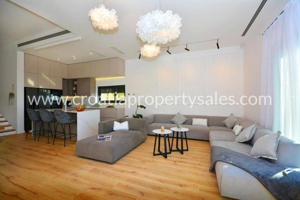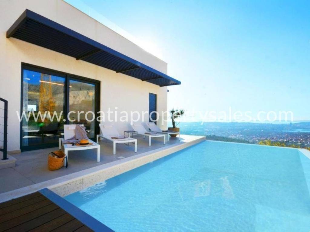 Villa with sea view near Split.It consists of three floors, basement, ground floor and first floor.In the basement there is a garage, on the ground floor there is a large living room and kitchen with a spacious dining room, and on the first floor there are bedrooms with bathrooms.In front of the villa there is an infinity pool and a beautiful terrace with a view of the city, sea and mountains. There is also a summer kitchen with a fireplace and a toilet.The villa has privacy, is surrounded mostly by nature, is ideal for living and as an investment.