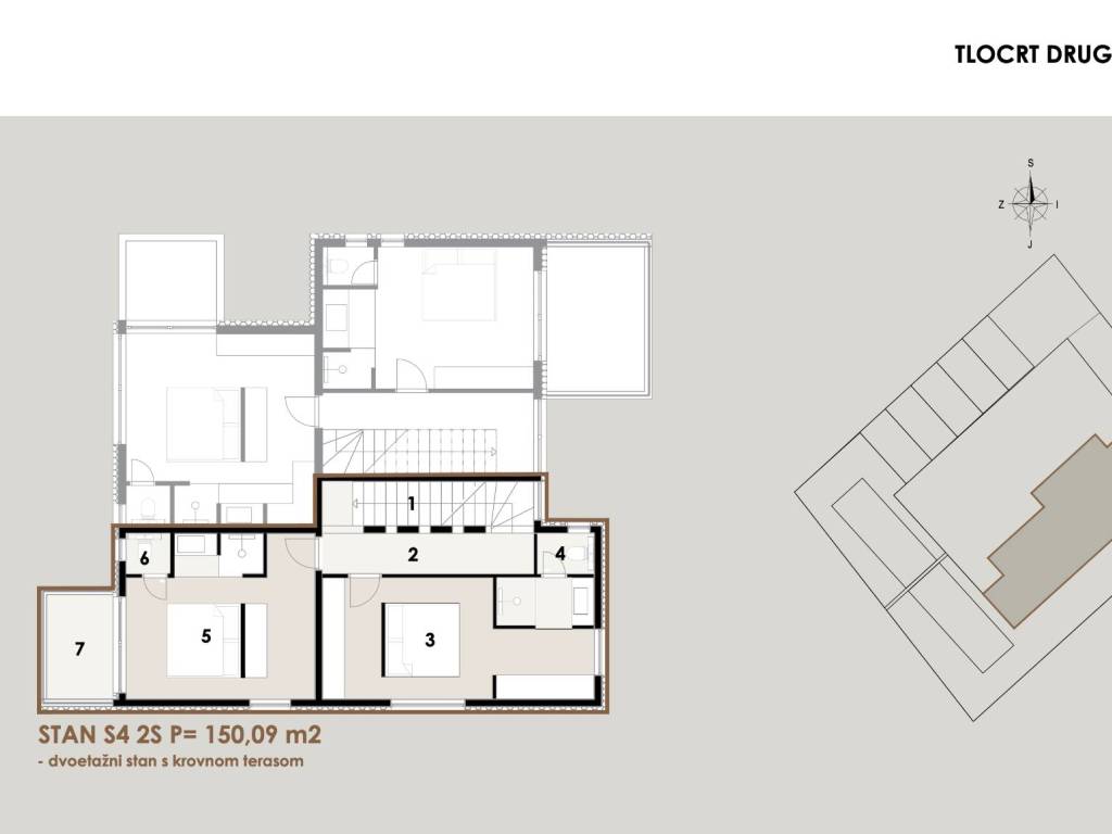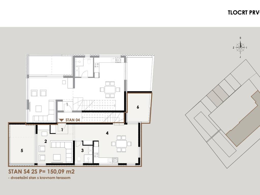 Ovaj luksuzan penthouse prostire se na impresivnih 150,09 m² (tlocrtna površina od 232,80 m²) i sastoji se od tri etaže: prvog i drugog kata te spektakularne krovne terase s privatnim bazenom. Svaka etaža je pažljivo osmišljena kako bi pružila najviši stupanj udobnosti, stila i uživanja u panoramskom pogledu na more.