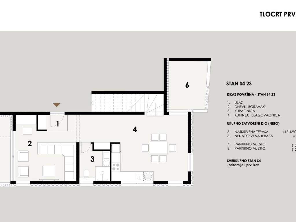 1. KAT - Ovdje ćete pronaći prostranu kuhinju, elegantnu blagovaonicu, udoban dnevni boravak, moderno kupaonicu, te natkrivene i nenatkrivene terase koje omogućuju uživanje u suncu i zraku na svježem zraku.