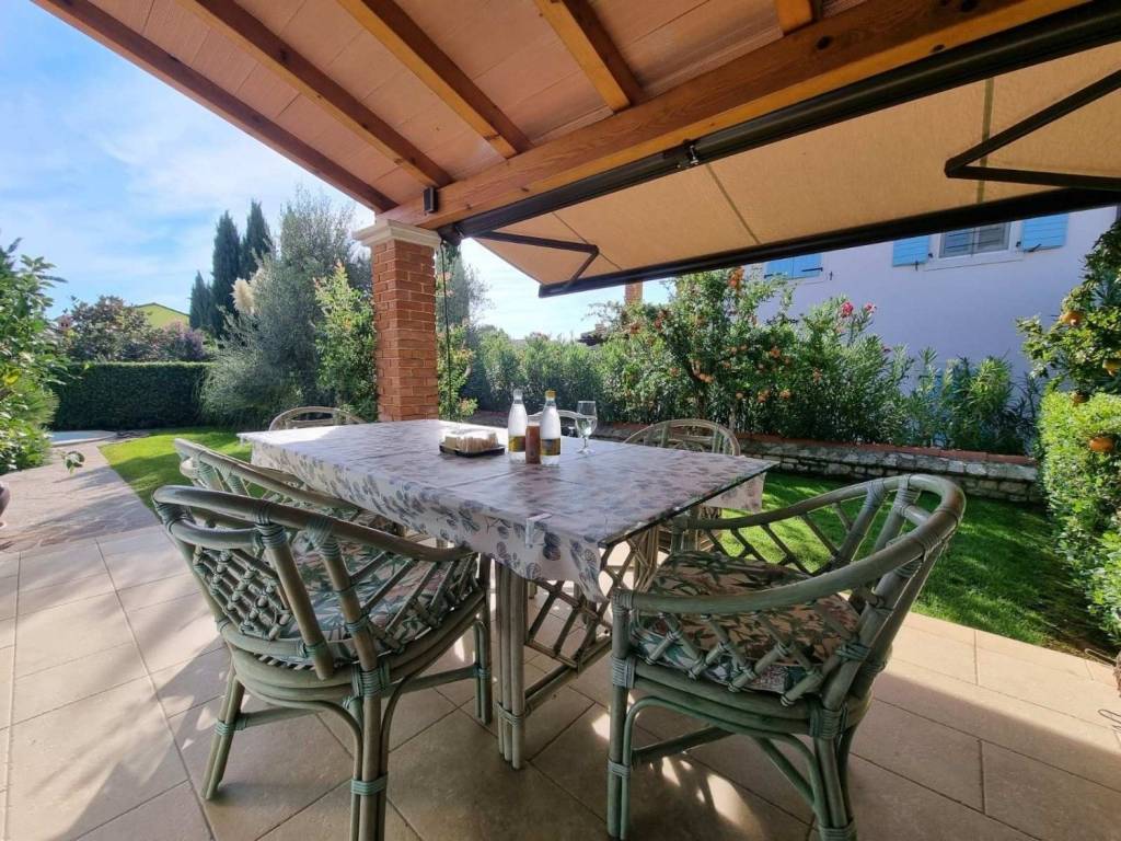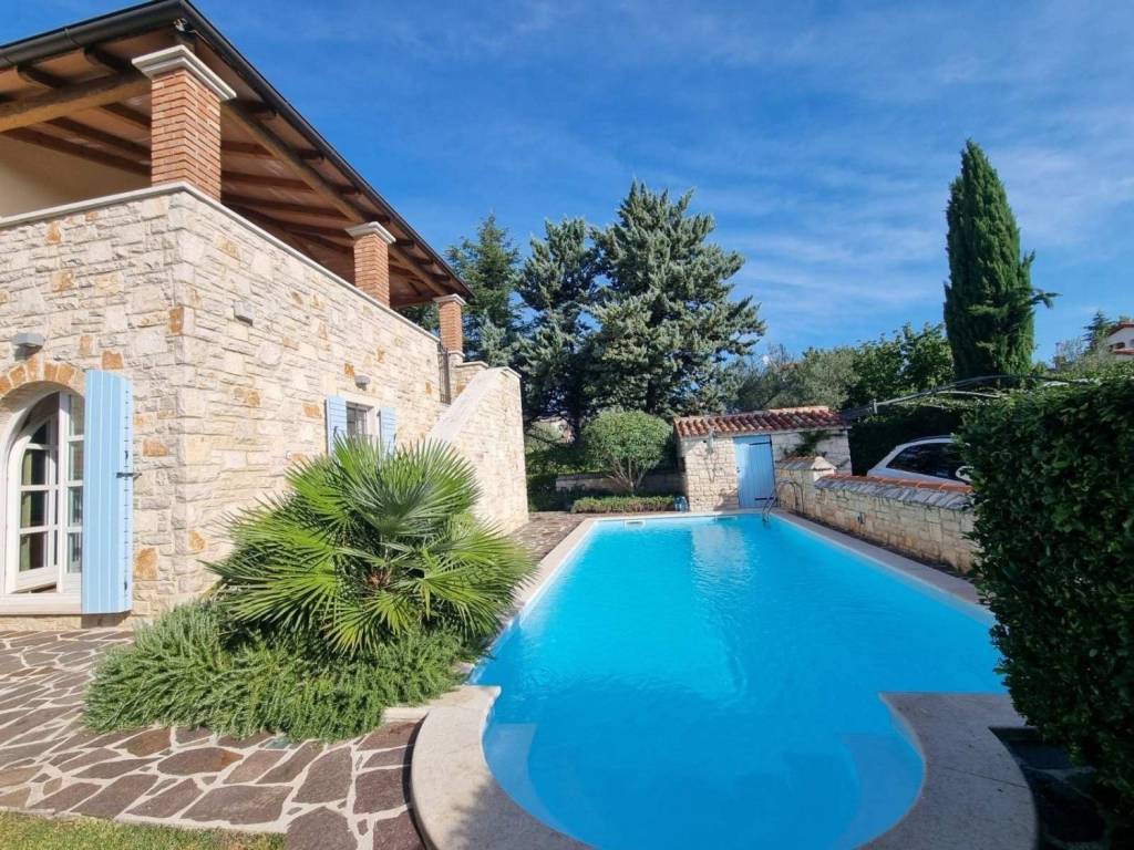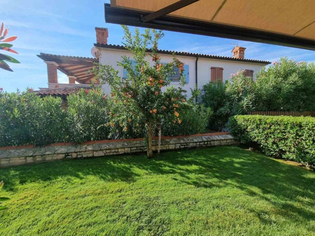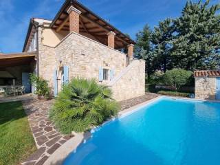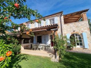 A beautiful semi-detached house is located in a quiet location not far from Poreč and only 1 km from the sea. It was built in 2006, and the owners renovated it in 2021, and are continuously maintaining it. They bought it and used it exclusively for their needs, the house has never been rented! It has a total of 155.55 m2 with terraces (135 m2 of closed space), on a plot of 367 m2. The garden is 200 m2. The house consists of a ground floor and a first floor, it has a Mediterranean-rustic style. On the ground floor there is a hallway, a bedroom, a bathroom, a large living room with a fireplace and a kitchen with a dining room. From the living room and the kitchen there is access to the covered terrace where there is another fireplace and dining table, and to the garden. Upstairs there are two more bedrooms, each with its own bathroom, which share a spacious covered terrace. The terrace is connected to the garden by an external staircase. The garden is beautifully landscaped with Mediterranean plants, an old olive tree, landscaped lawn, and a 30 m2 swimming pool. Next to the pool, a small stone garden house of 7 m2 has been built, where everything is provided for the sauna or can be used as a storage room. There is an outdoor shower next to the pool and the house. The house has 2 parking spaces. The entire garden is enclosed by a wall, greenery or a metal fence. In the back of the house, near the pool, there is a storage room/boiler room and a summer kitchen. The house is sold with custom-made furniture for the entire house. The heating is regulated centrally on heating oil. Portable air conditioning is installed only in one bedroom. An alarm and a video camera were also installed. The house can be moved in immediately!