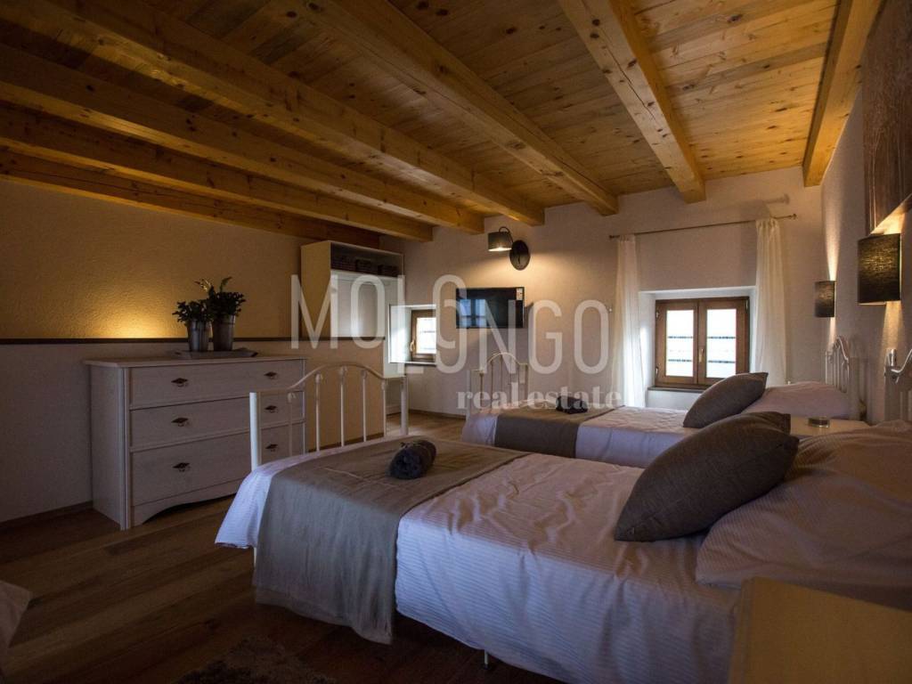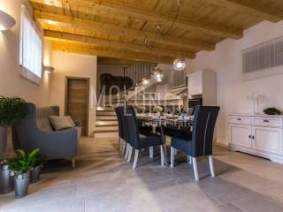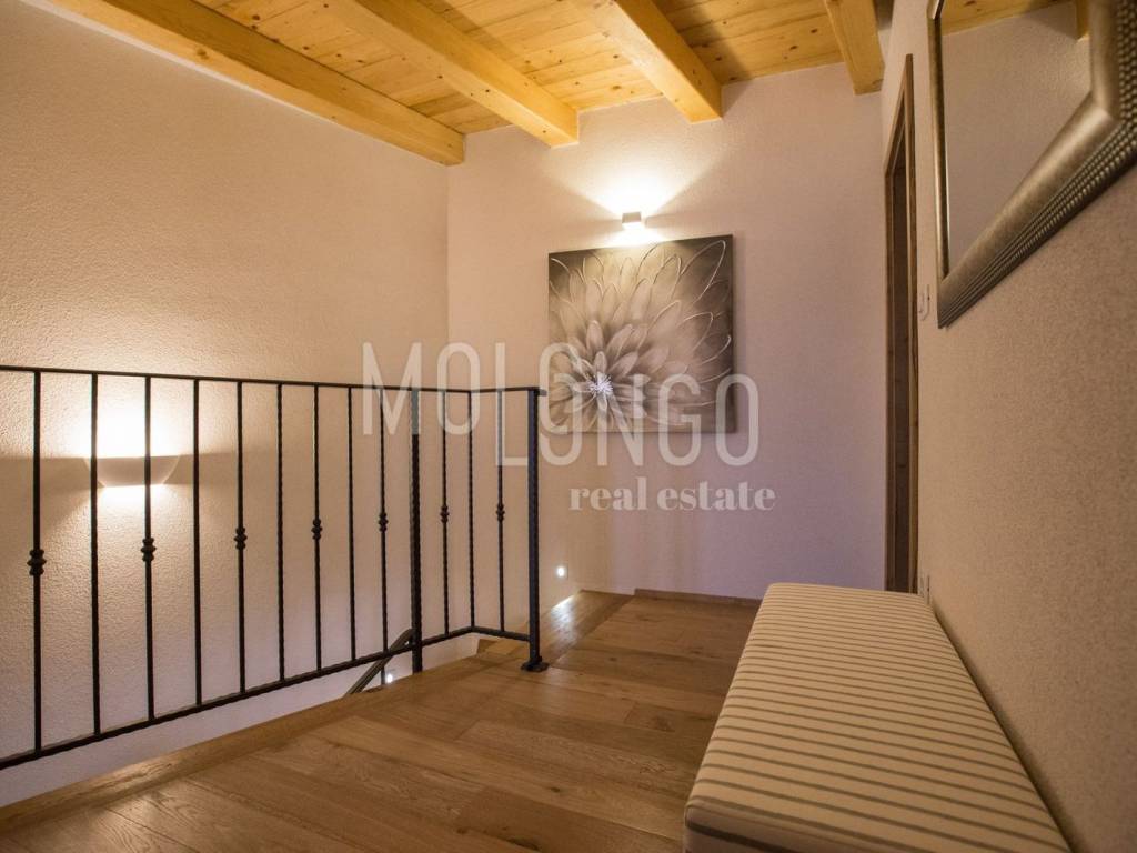 La prima unità comprende un’area benessere con jacuzzi e sauna, un bagno di servizio, una camera da letto con bagno al primo piano, e una galleria all’ultimo piano trasformata in zona notte.
